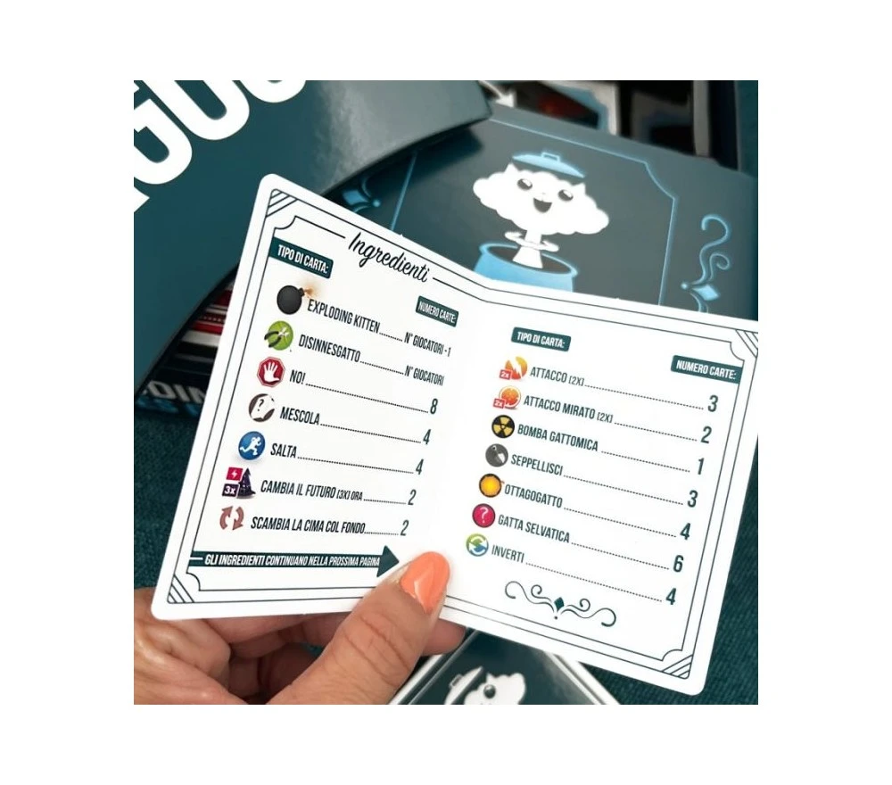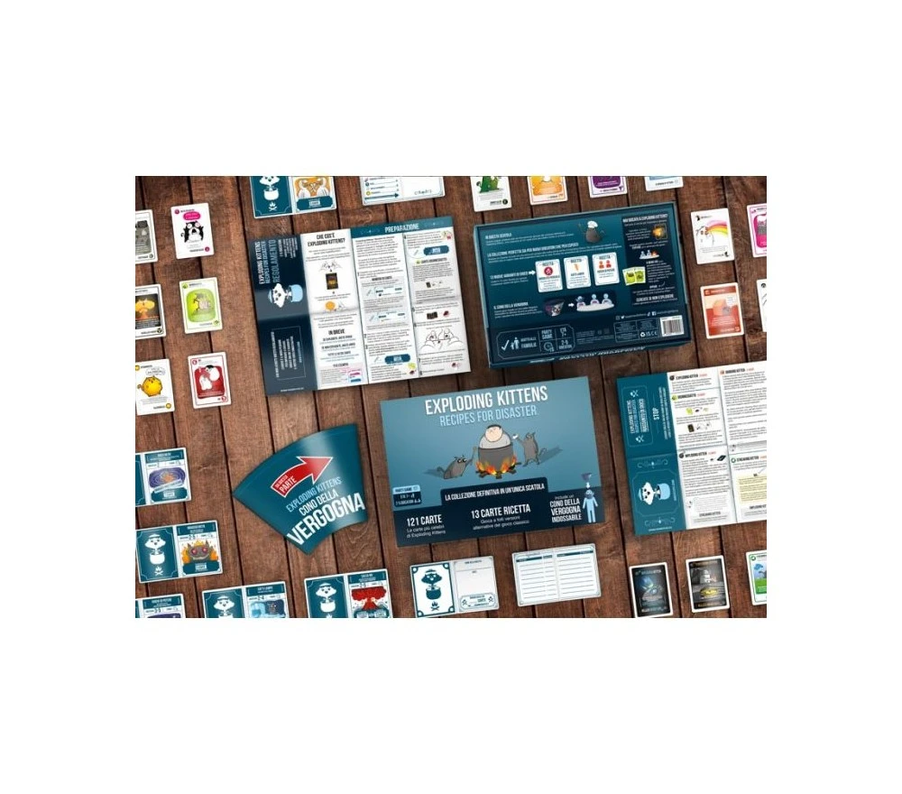 Elementi di Gioco: 121 carte più celebri di Exploding, 13 carte Ricetta (13 nuove varianti di gioco), 1 Cono della Vergogna, 1 Regolamento.