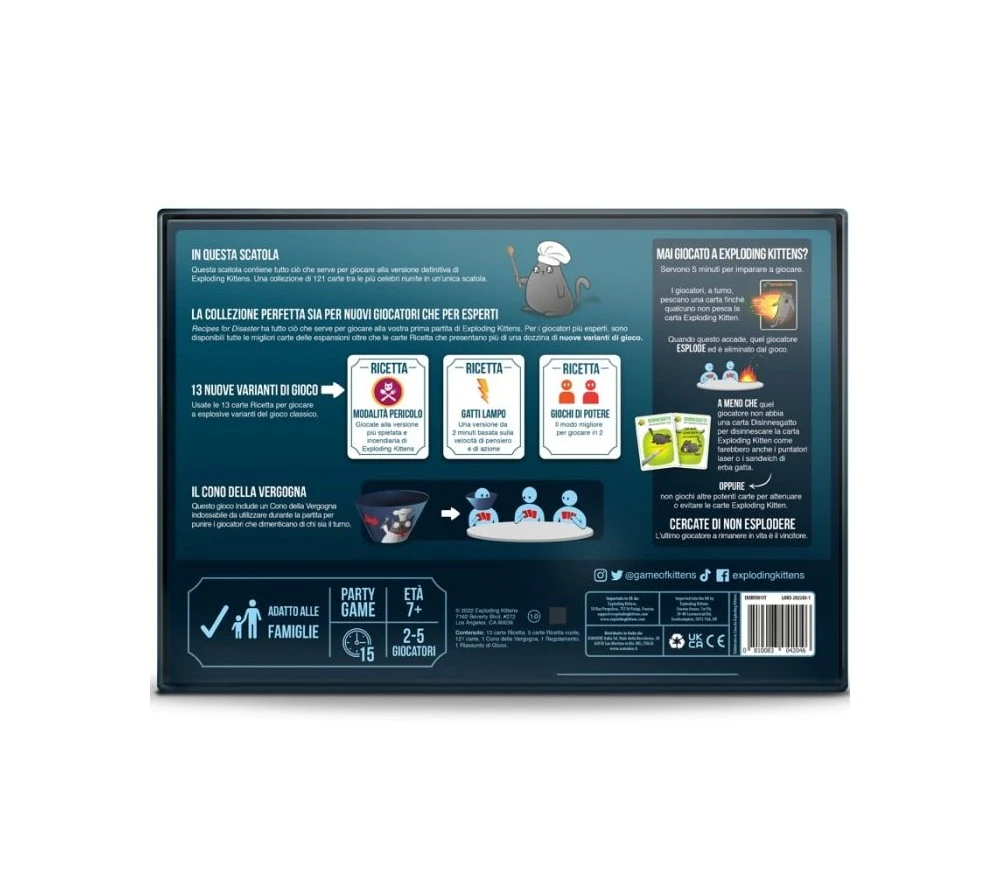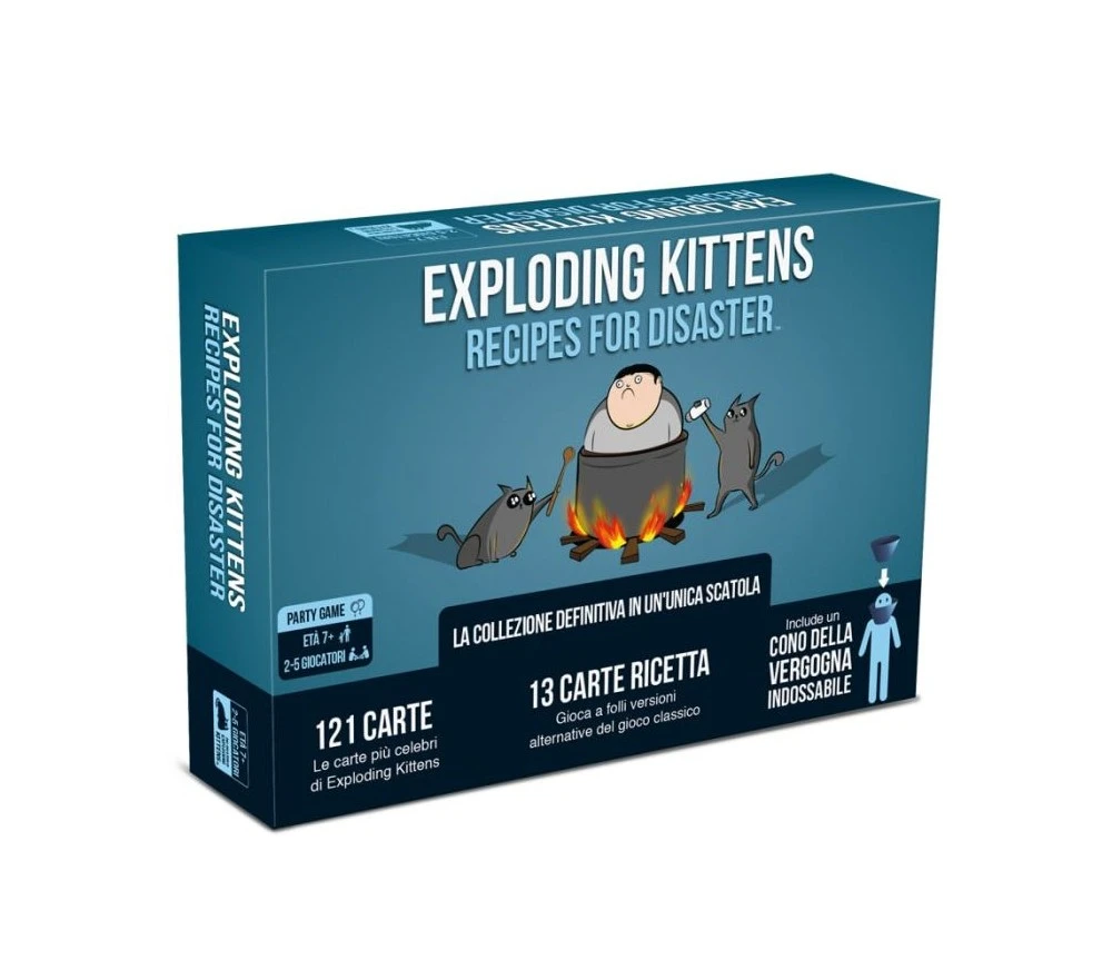 Exploding Kittens: Recipes for Disaster è un gioco stand alone della linea Exploding Kittens. Una collezione di 121 carte tra le più celebri riunite in un’unica scatola con anche le carte Ricetta che presentano 13 nuove varianti di gioco.