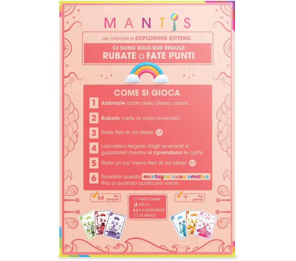 Ci sono solo due azioni disponibili: Rubare o Fare Punti. Con la sua semplicità e scorrevolezza di gioco, Mantis è pensato sia per i bambini che per gli adulti.