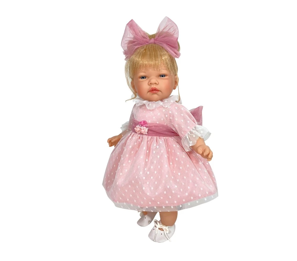 Celia è una tenera bimba con un’espressione sognante e i capelli raccolti da un vaporoso fiocco in tulle. Ha un elegante abitino rosa con tulle plumetis e deliziose scarpine bianche. L’abito è impreziosito da una cintura con fiori.