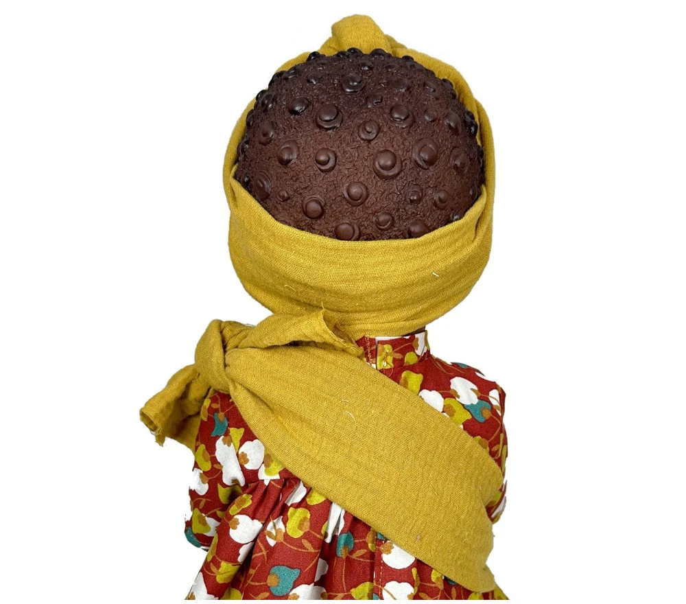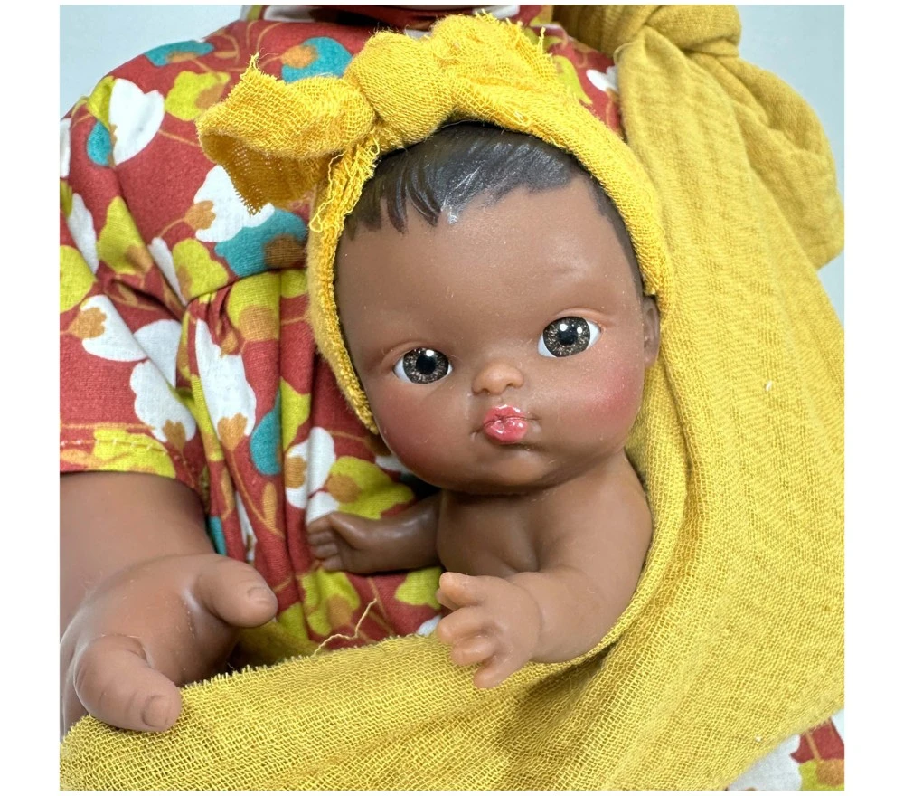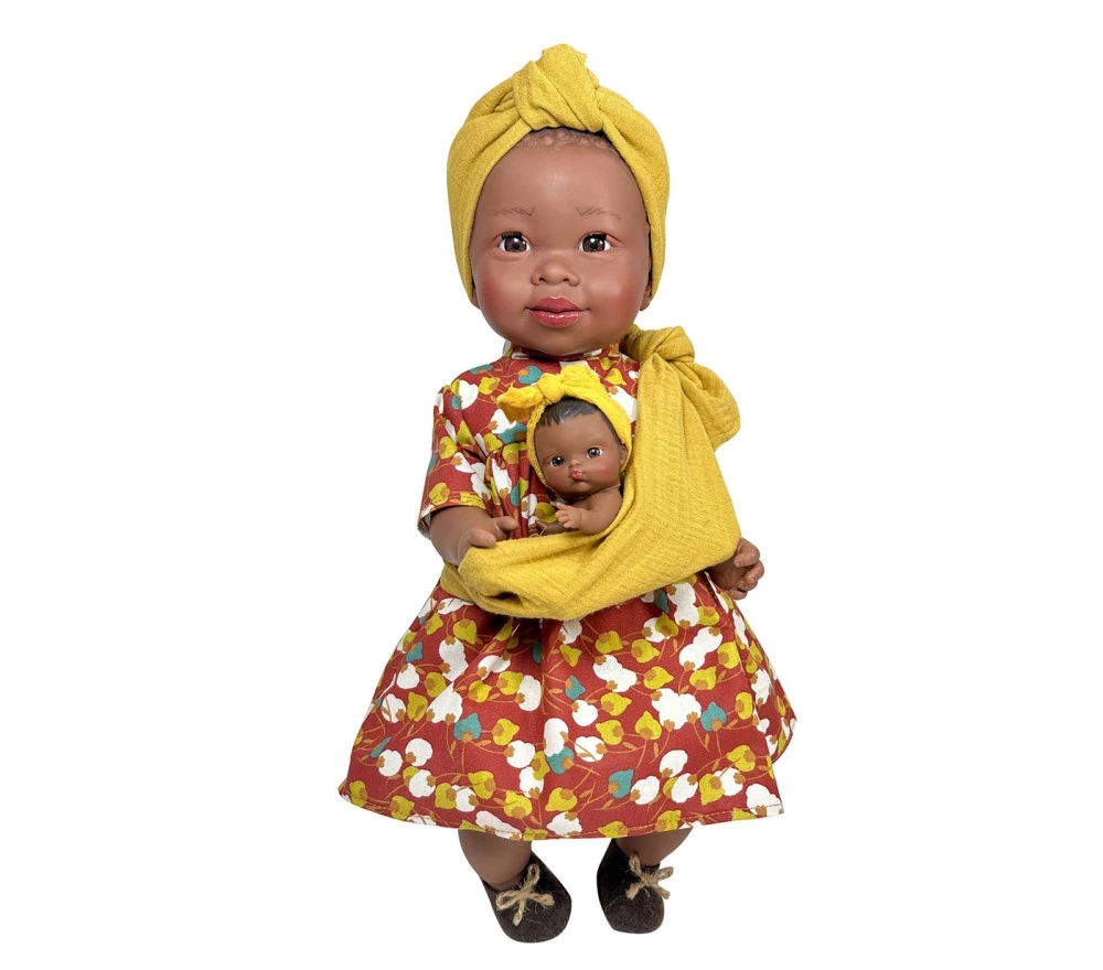 Maria è una bambola dalla pelle scura e dallo sguardo dolcissimo. Vestita con un vivace abito ispirato ai tessuti wax della tradizione africana. scarpette, ed ha anche una fascia porta bebè, con all’interno un neonato con fascia per capelli coordinata.