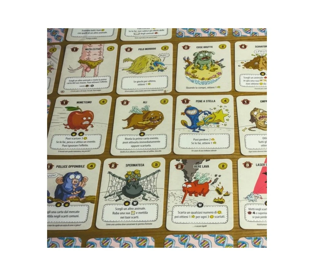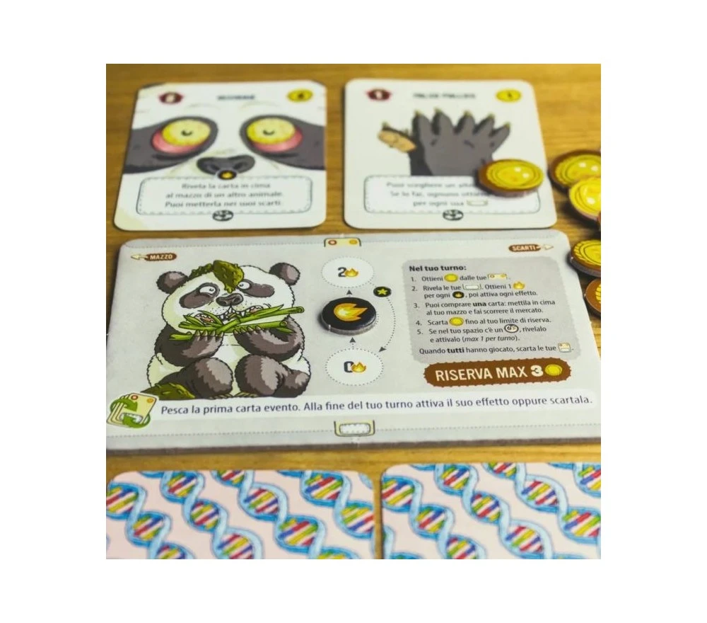 Parlo con te, triste animale male evoluto, sei pronto a una frenetica gara? Presentati al cospetto dell’evoluzione prima dei tuoi avversari, possibilmente con più gettoni di loro, acquista i tuoi adattamenti evolutivi per sopravvivere ai catastrofici eventi di estinzione e usa i tuoi micidiali poteri per fermare gli altri animali.
