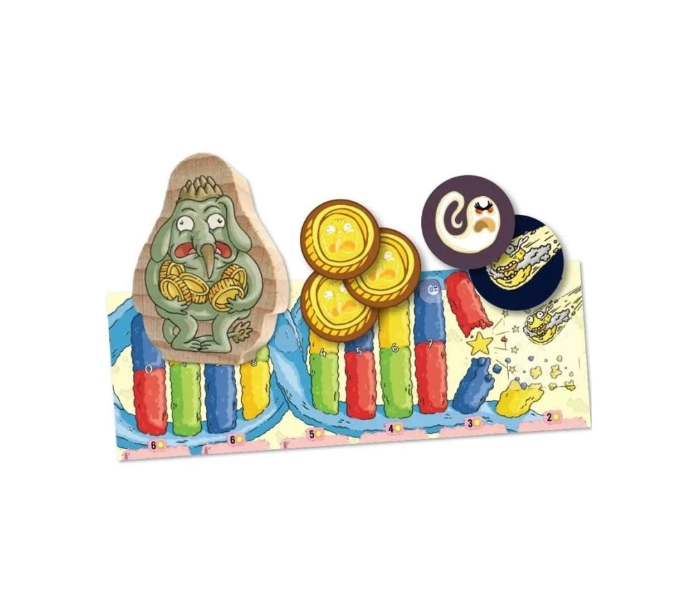 Un massiccio Totem di legno e… 1 acidissimo Tabellone, 36 gettoni Evoluzione, 6 segnalini Pressione Evolutiva e molto, molto altro!