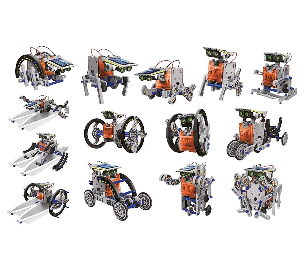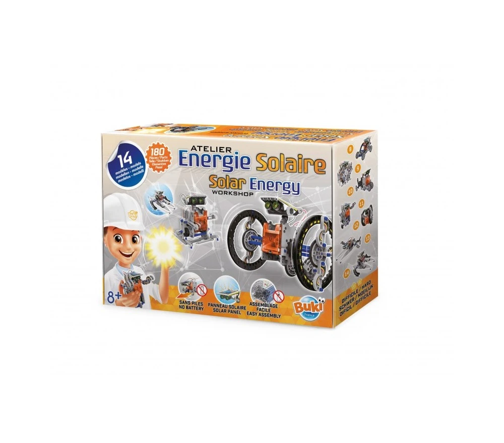 Un ricco kit di 180 pezzi per costruire 14 diversi modellini che funzionano ad energia solare, grazie al piccolo pannello compreso. Da 8 anni in su.