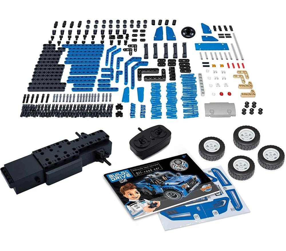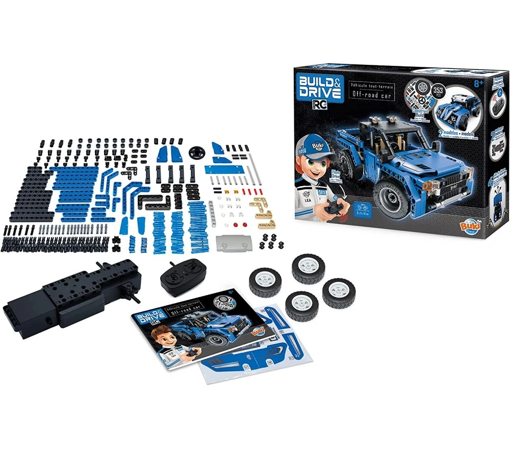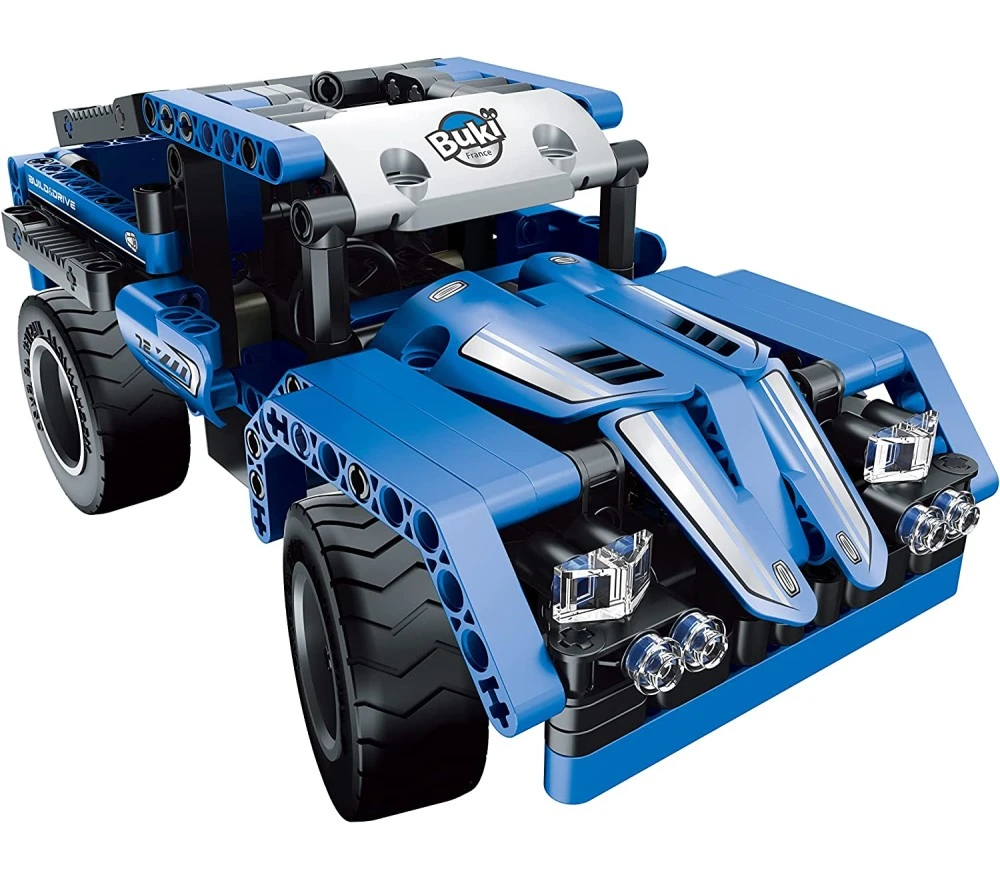 I bambini si divertiranno un mondo a guidare questo bolide da fuoristrada, costruito con le proprie mani! con i 353 pezzi a disposizioni e il manuale illustrato potranno scegliere tra due modelli (pick up o 4×4) da montare. Il radiocomado funziona a 2,4 GHz. L’auto montata misura circa 21 cm in lunghezza.