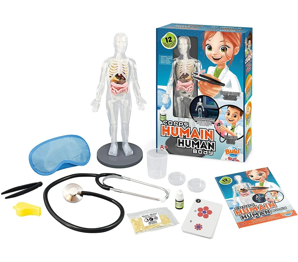 Un kit divertente per imparare tutto sul corpo umano! Nella confezione è compreso un modellino anatomico che si illumina al buio (alto circa 30 cm) con organi morbidi che si possono mettere e togliere. Il kit propone 12 diverse attività per scoprire i segreti del corpo umano, da realizzare con i diversi accessori, compreso uno stetoscopio, in dotazione. Manuale multiligue incluso. Da 8 anni in su.