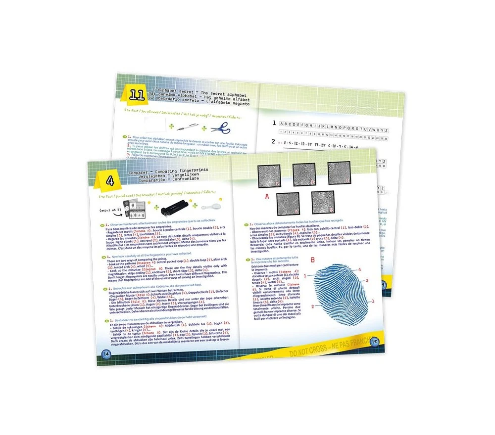 Un ricco kit con 12 diversi esperimenti per scoprire le tecniche dei detective: come creare un identikit, inviare messaggi sefreti, analisi delle prove, raccogliere impronte digitali. Il set comprende anche occhiali, lente d’ingrandimento, microscopio e una lampada UV oltre al manuale illustrato con le attività da svolgere Richiede 2 batterie LR41 incluse e 2 batterie LR06 non incluse . Da 8 anni in su.