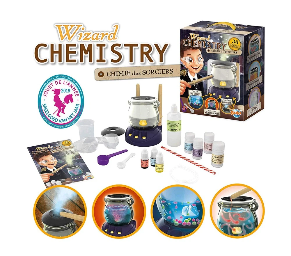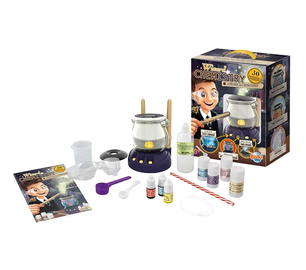 Un curioso kit con il necessario per svolgere 30 esperienze che sembreranno delle vere e proprie magie… invece si tratta di pura scienza! Il paiolo non solo permette la realizzazione degli esperimenti ma ha anche effetti luminosi, di fumo ed è un vero e proprio miscelatore. Il kit è ricco di accessori (bacchetta magica, coloranti, prodotti chimici sicuri, cucchiai e occhiali protettivi) e di un chiaro libretto di istruzioni illustrato. Cambiare colore all’acqua, creare vermi viscidi, far scomparire sostanze… i bambini si divertiranno un mondo, imparando interessanti nozioni chimiche. Da 8 anni in su.