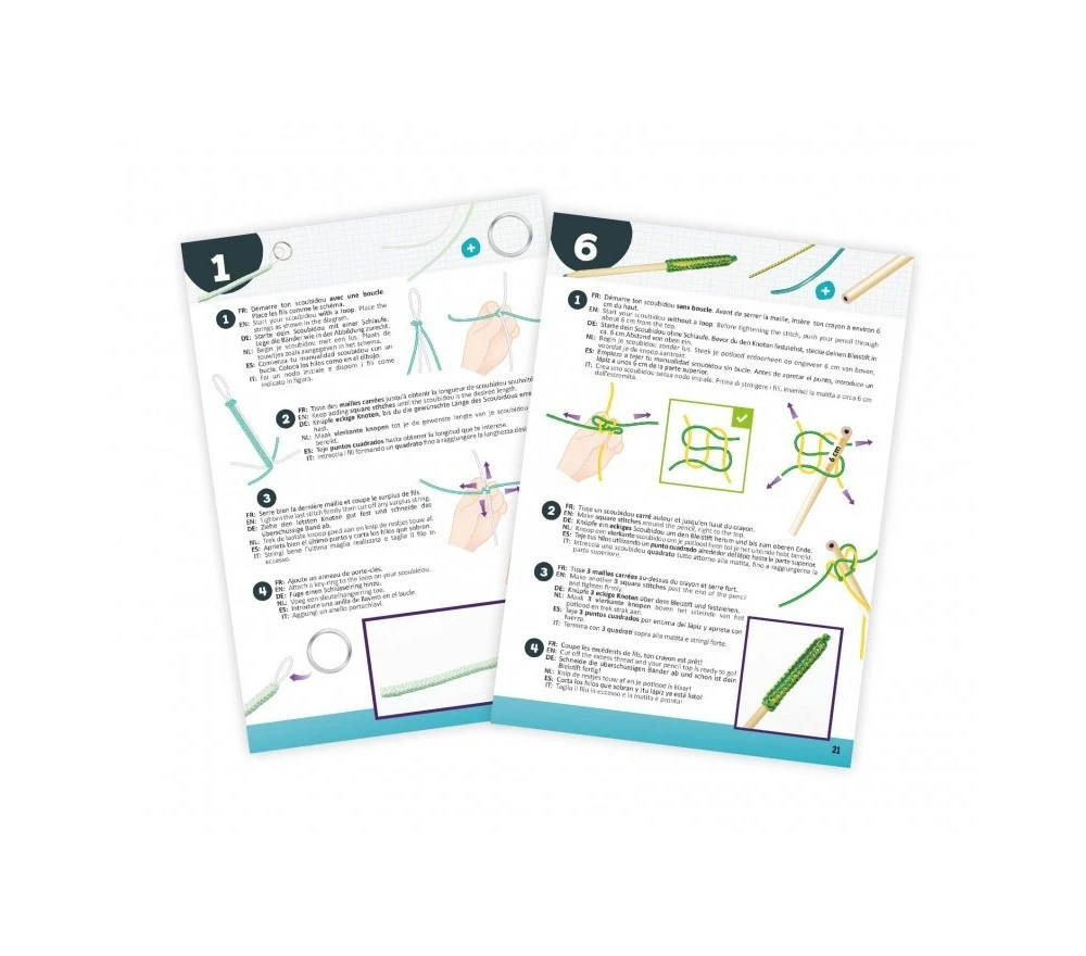 Il set permette di realizzare 12 diversi scoubidou, più alcuni fili extra per poter creare i tuoi design.
