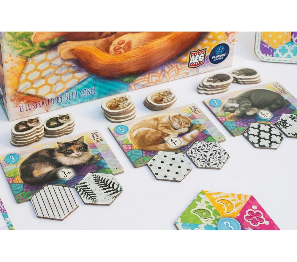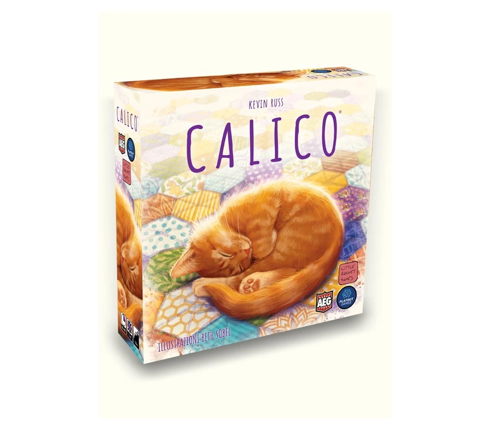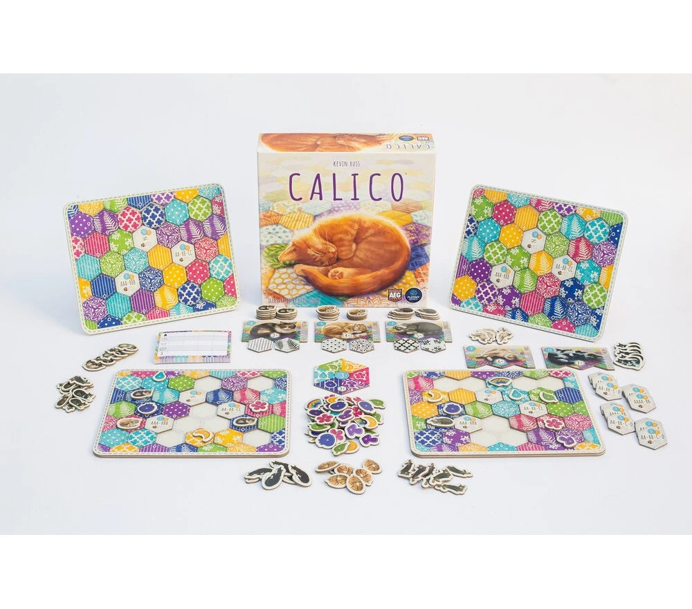 In Calico™, i giocatori competono per cucire la Trapunta più accogliente per gli adorabili gattini, mentre scelgono e posizionano Tessere Patch di diversi colori e motivi sulla loro plancia trapunta. Ogni plancia includerà 3 Tessere Obiettivo Design che daranno punti se i loro requisiti saranno soddisfatti.