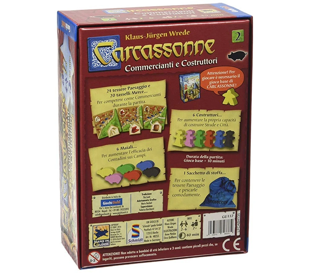 La seconda espansione per il gioco Carcassonne. Oltre a nuove tessere particolari vengono introdotti i seguenti personaggi: i commercianti, con le loro merci, fanno guadagnare ulteriori punti ai propri giocatori, i maiali accrescono il valore dei terreni e i costruttori consentono di piazzare tessere aggiuntive, accellerando lo sviluppo di città e strade. E`incluso un sacchetto di stoffa che rende più semplice mescolare e pescare le tessere. NUOVA VERSIONE CON LA GRAFICA AGGIORNATA ALLA NUOVA EDIZIONE DI CARCASSONNE GIOCO BASE.