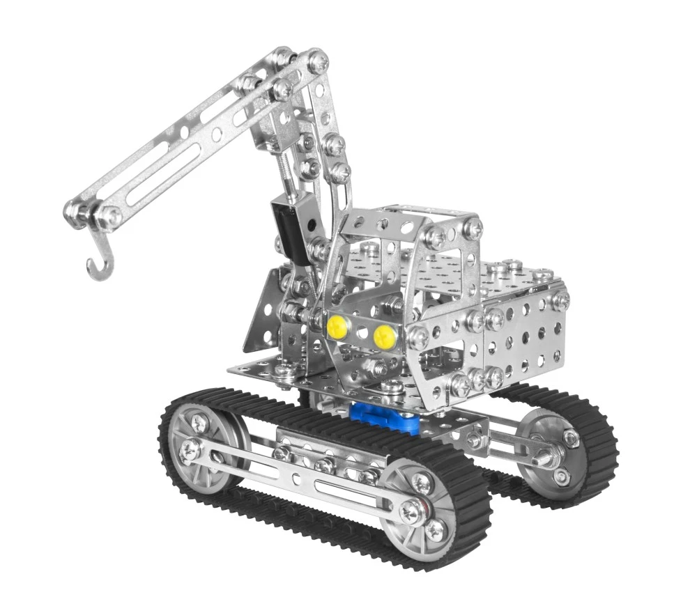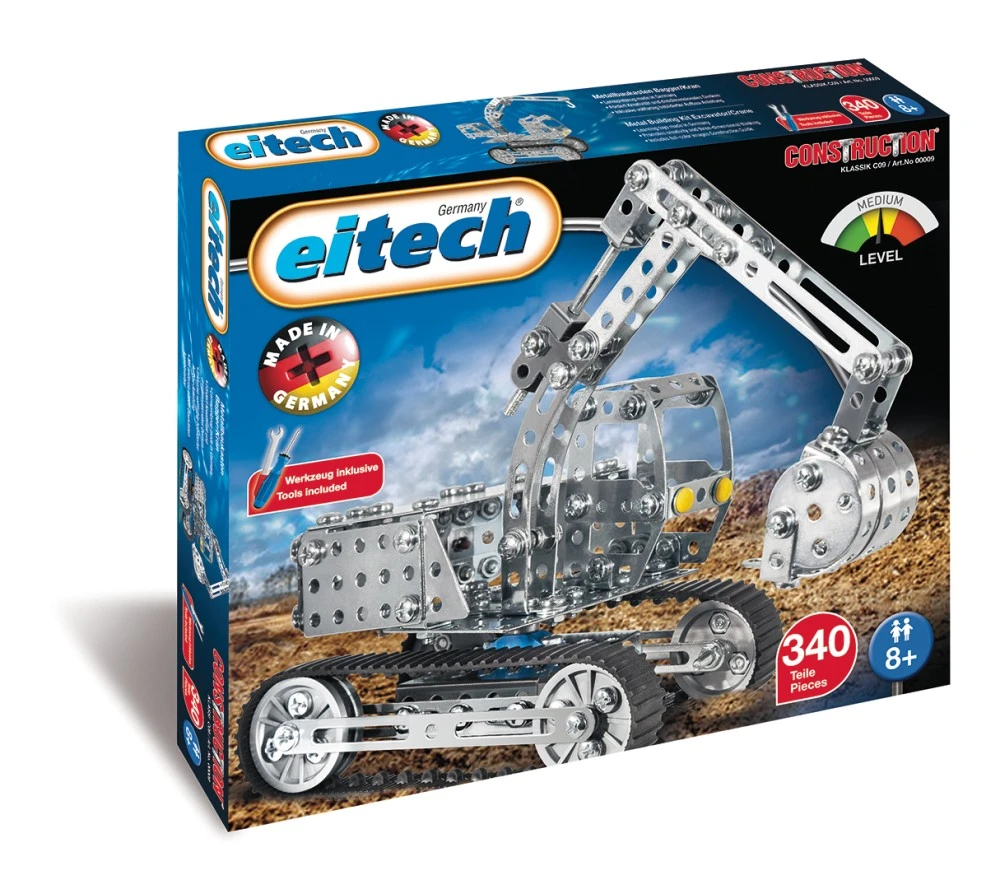 Un kit di costruzioni in acciaio del marchio Eitech per costruire tre diversi modelli: un escavatore cingolato, una gru cingolata ed un mezzo di soccorso. Il kit, da 340 Pezzi, contiene tutti gli attrezzi necessari al montaggio. Da 8 anni in su.