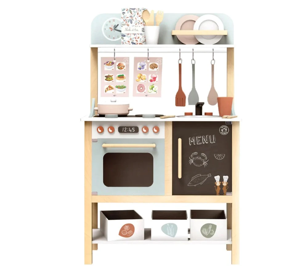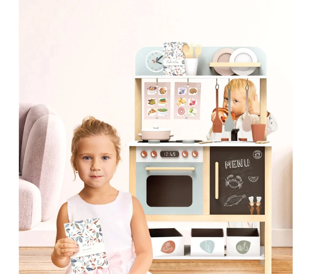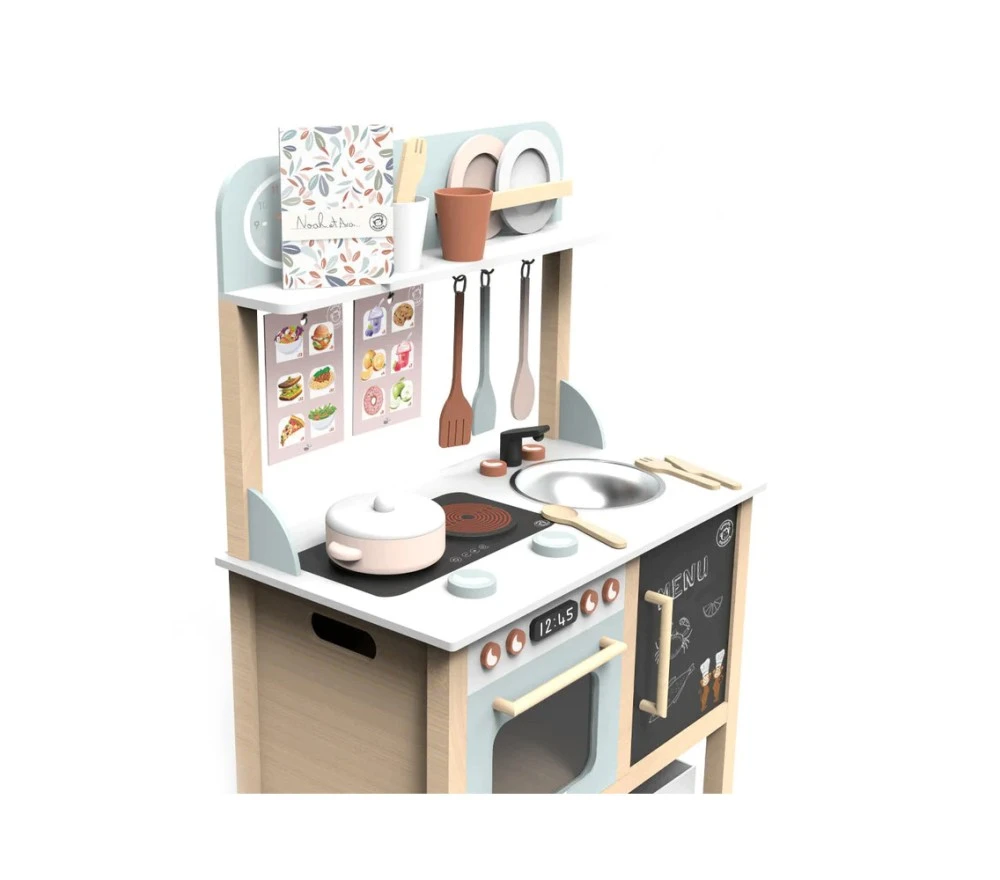 Una simpatica cucina in legno, composta da 23 pezzi: piano cottura, forno, lavello, sveglia, tazze, piattino, piatti, menu e molto altro.