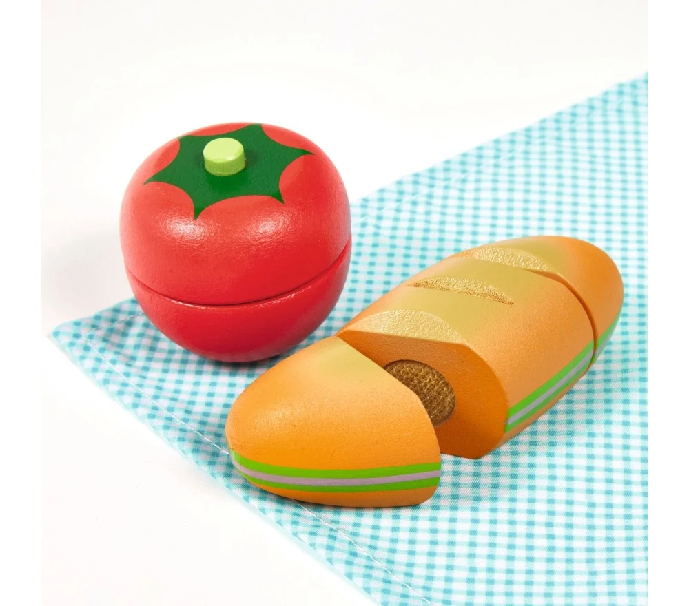 Un classico gioco di imitazione: diversi tipi di alimenti a tocchetti, uniti dal velcro, da « tagliare » con il coltello in legno e ricomporre all’infinito. In legno FSC.