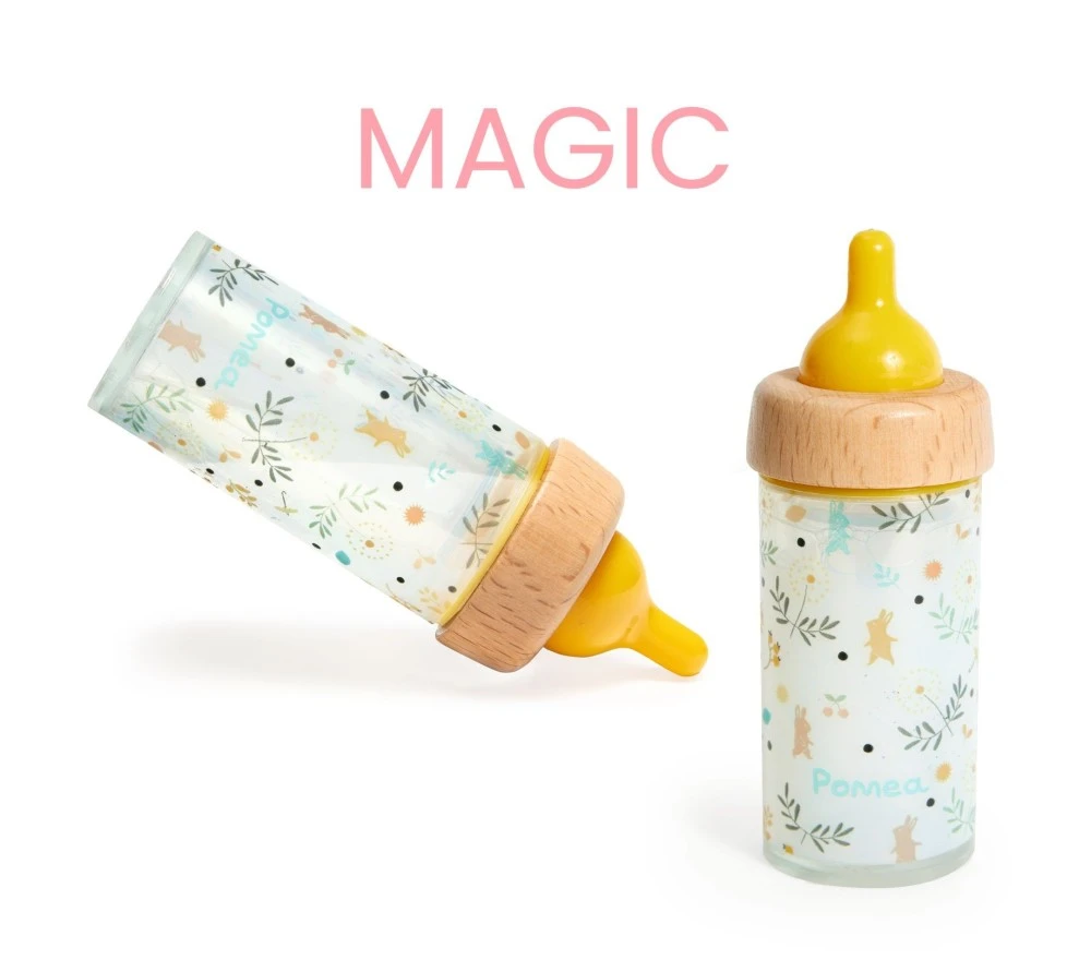 Un simpatico biberon in plastica antiurto e legno FSC dall’effetto magico. Se lo si tiene dritto sembra pieno, ma girandolo… il latte sparisce come se fosse stato bevuto dalla bambola!