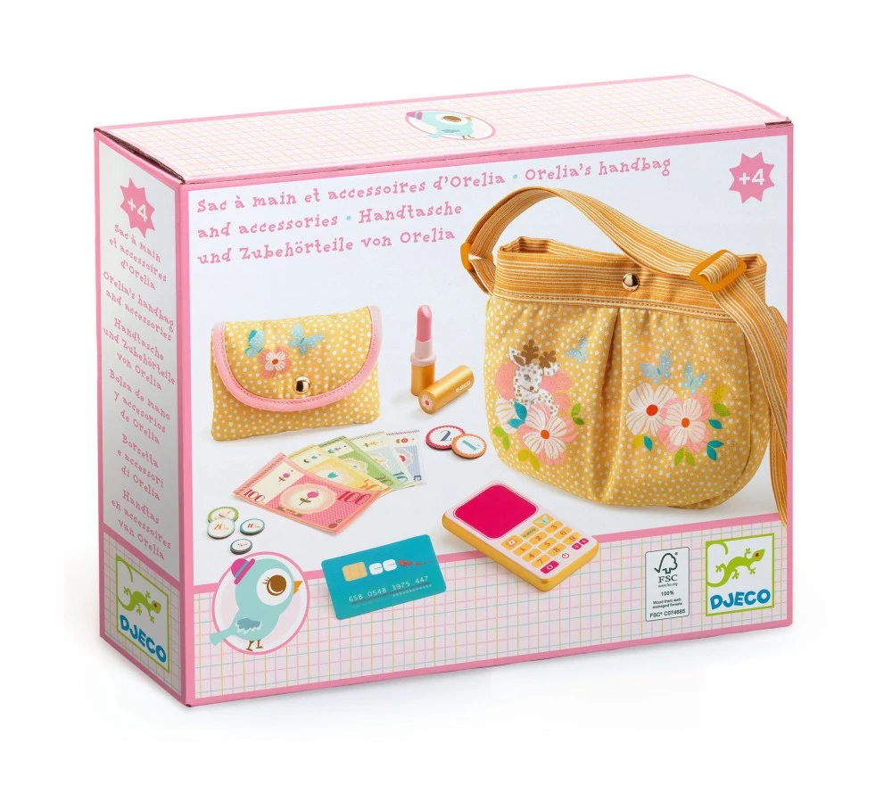 Dai toni color oro, la borsetta ha una delicata stampa floreale e i seguenti accessori: portamonete con chiusura magnetica, rossetto, cellulare, soldini e carta di credito (tutti « finti » e in legno per stimolare fantasia e immaginazione!).
