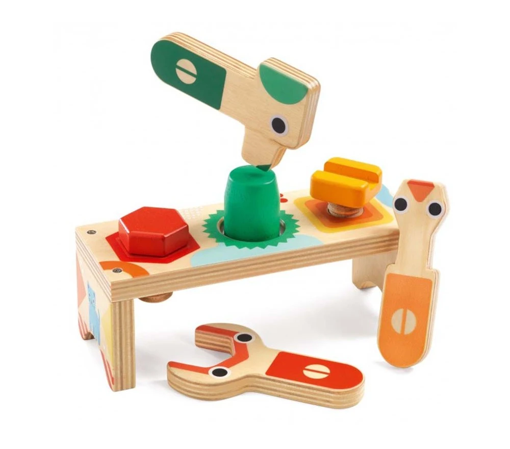 Un gioco in legno perfetto per affinare la manualità. I bimbi si divertiranno a battere con il martelletto e ad avvitare e svitare con cacciavite e chiave inglese a misura di bimbo. Non solo! Il gioco è utilissimo anche per riconoscere le prime forme ed i colori. Dimensione 19 x 11 x 7,5 cm. Da 18 mesi in su.