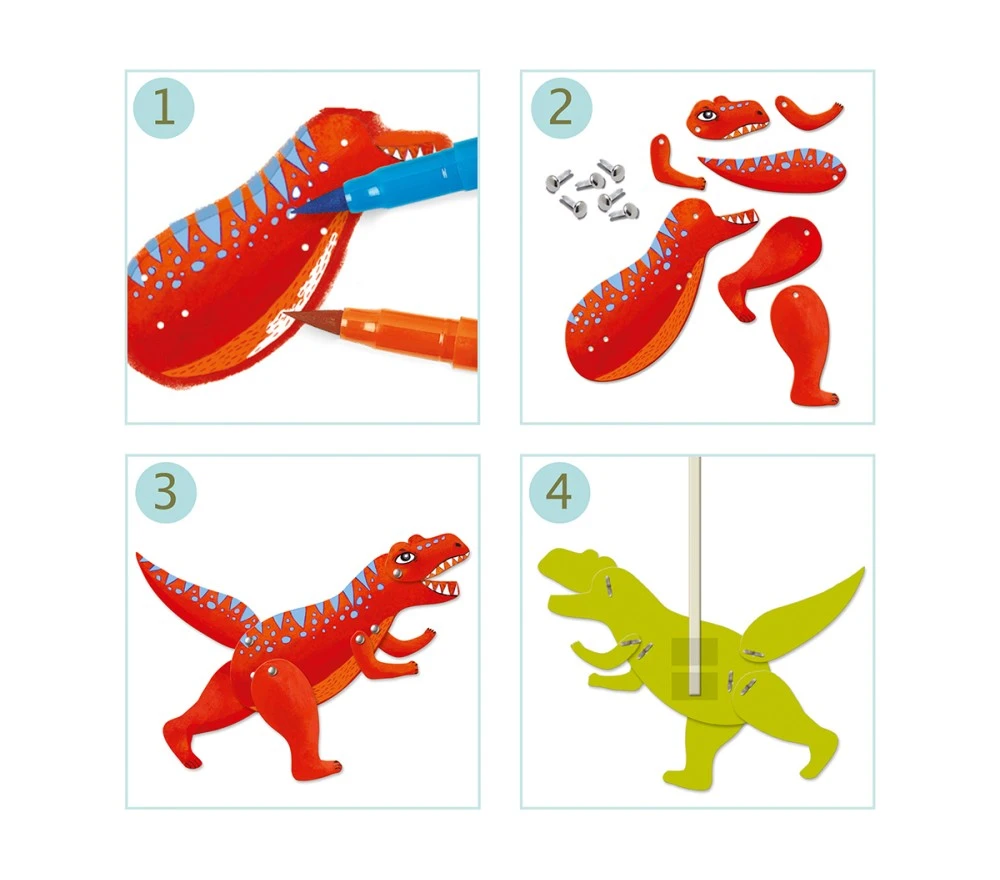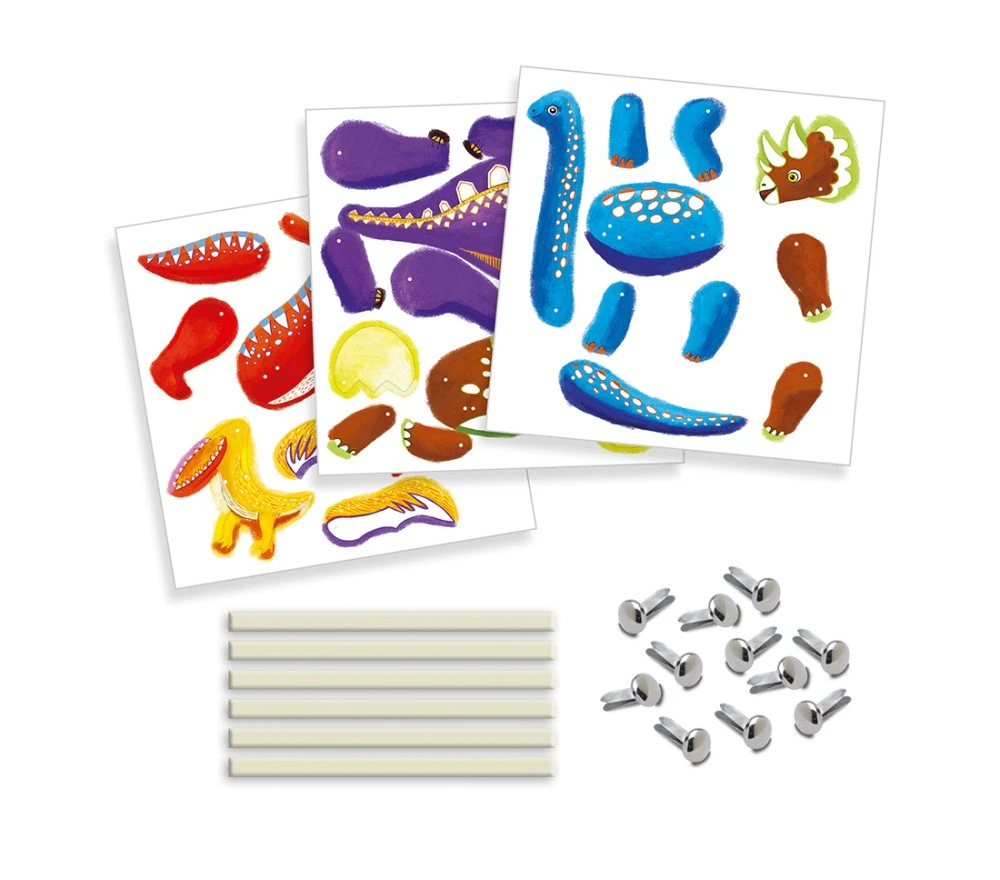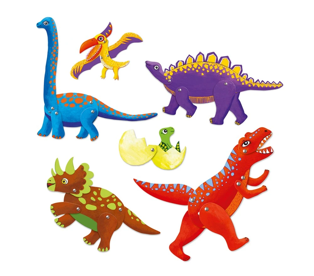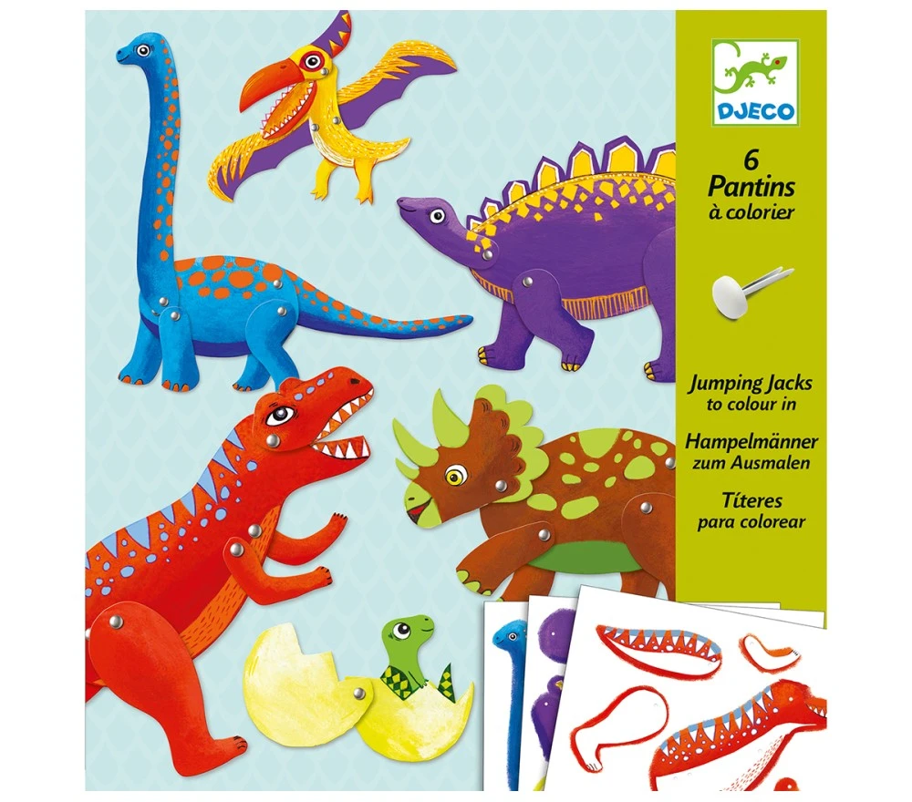 Un mini set creativo 2 in 1 per colorare e montare 6 fantastici burattini di dinosauri, con gli arti che si possono muovere. Basterà colorarli, staccare i vari componenti, montarli con i fermacampione e si otterranno 6 figure da fissare sui bastoncini con cui giocare ed inventare mille avventure!