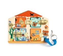Una tavoletta in legno con cui i bimbi alleneranno la motricità fine, sfidandosi, in sicurezza, con diversi tipi di serrature. Sotto ogni finestrella troveranno una divertente scenetta!