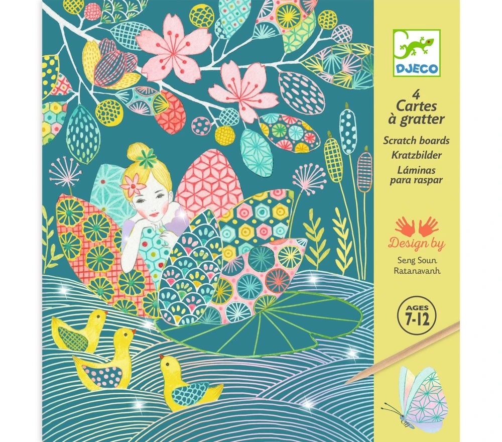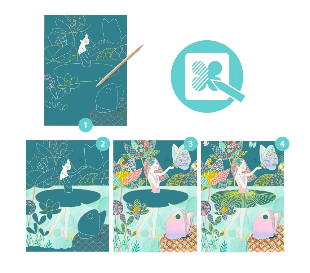 Un kit di quadretti da grattare per scoprire delle illustrazioni meravigliose, in puro stile Djeco. Il set contiene: 4 quadretti da grattare, un bastoncino appuntito in legno e una guida passo passo. Dimensioni quadro circa 20 x 15 cm. Da 7 anni in su.