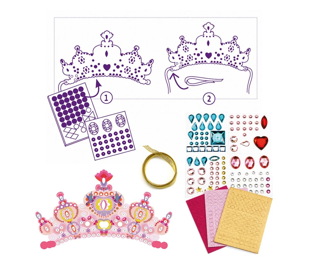 Contenuto: 4 diademi in cartoncino illustrati, 3 schede di tasselli adesivi in gommapiuma glitterati, 4 schede di adesivi « pietre preziose », 4 nastrini dorati, 1 libretto delle istruzioni.