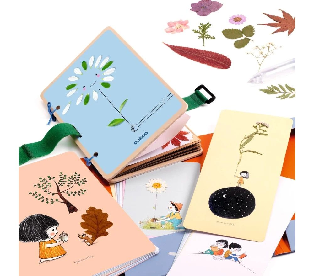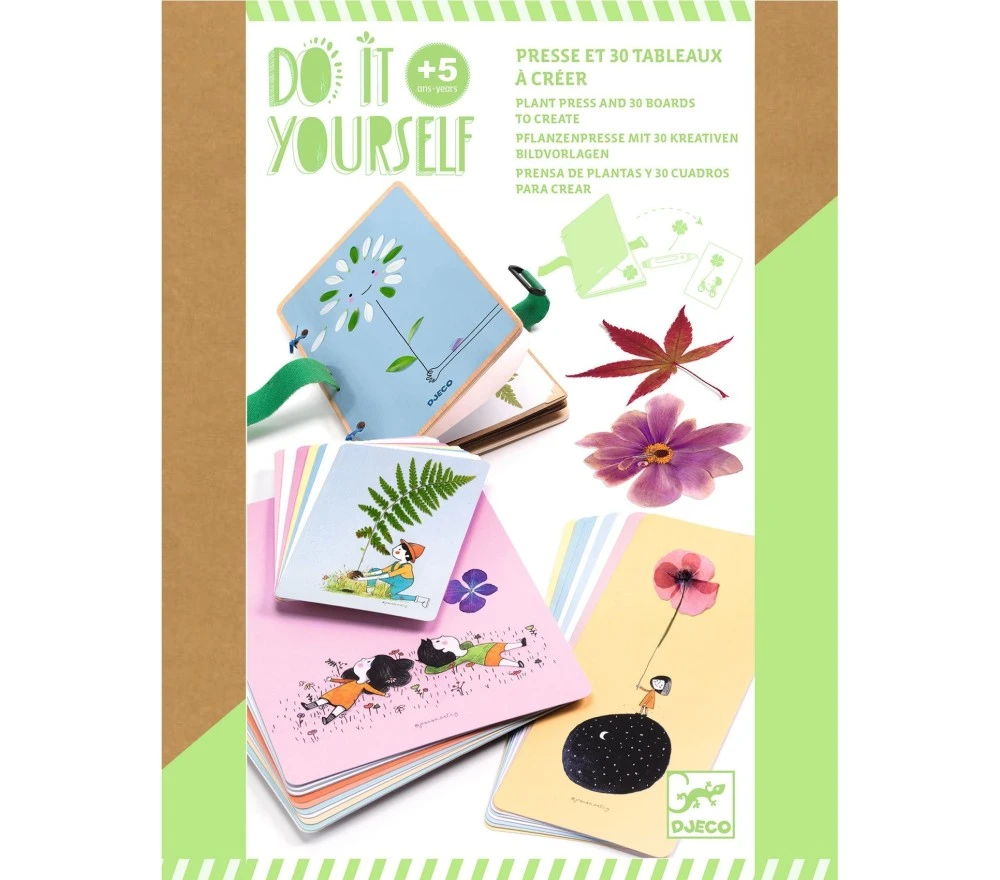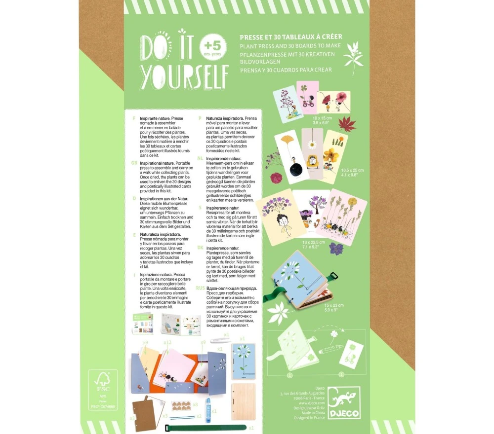 Un ricco kit creativo per aiutare i bambini a scoprire la bellezza della natura. Contiene una pressa da assemblare e portare in giro per raccogliere piante e fiori e 30 tavole e schede da decorare.