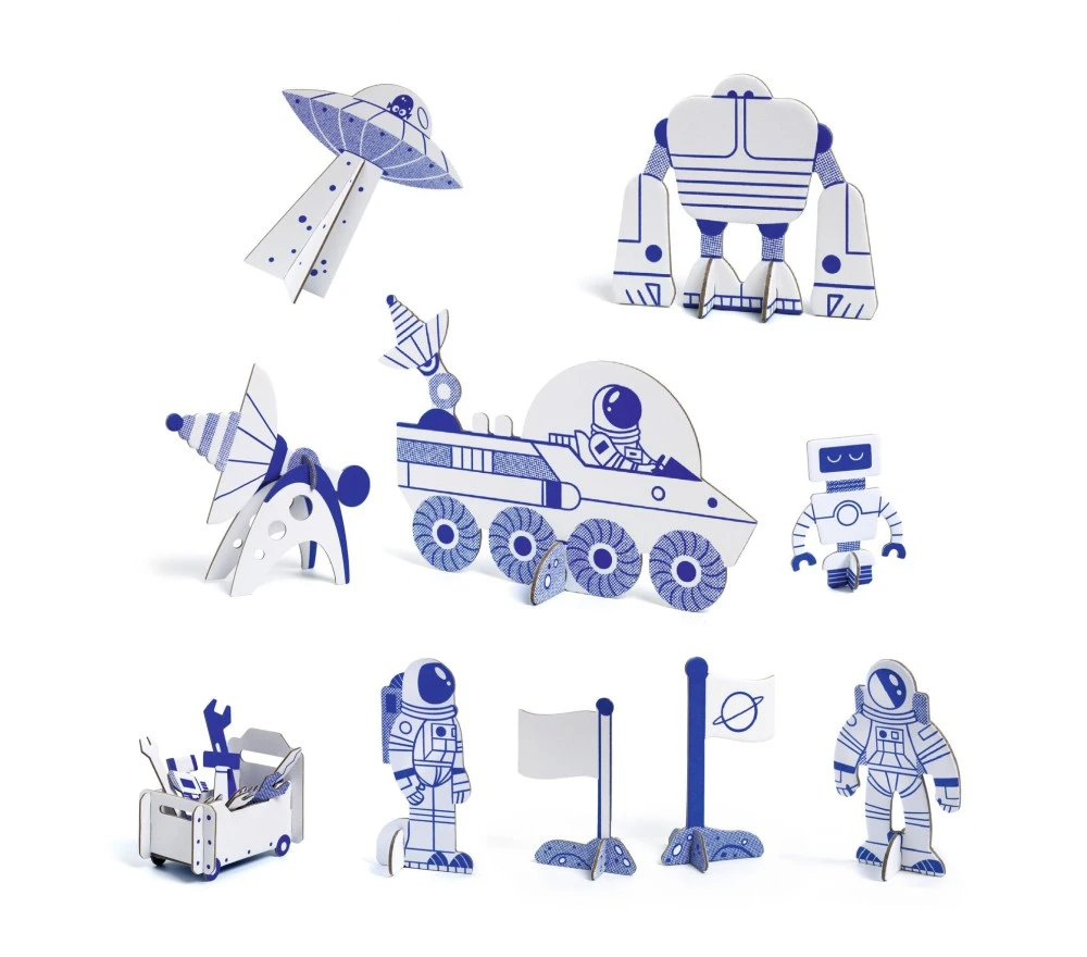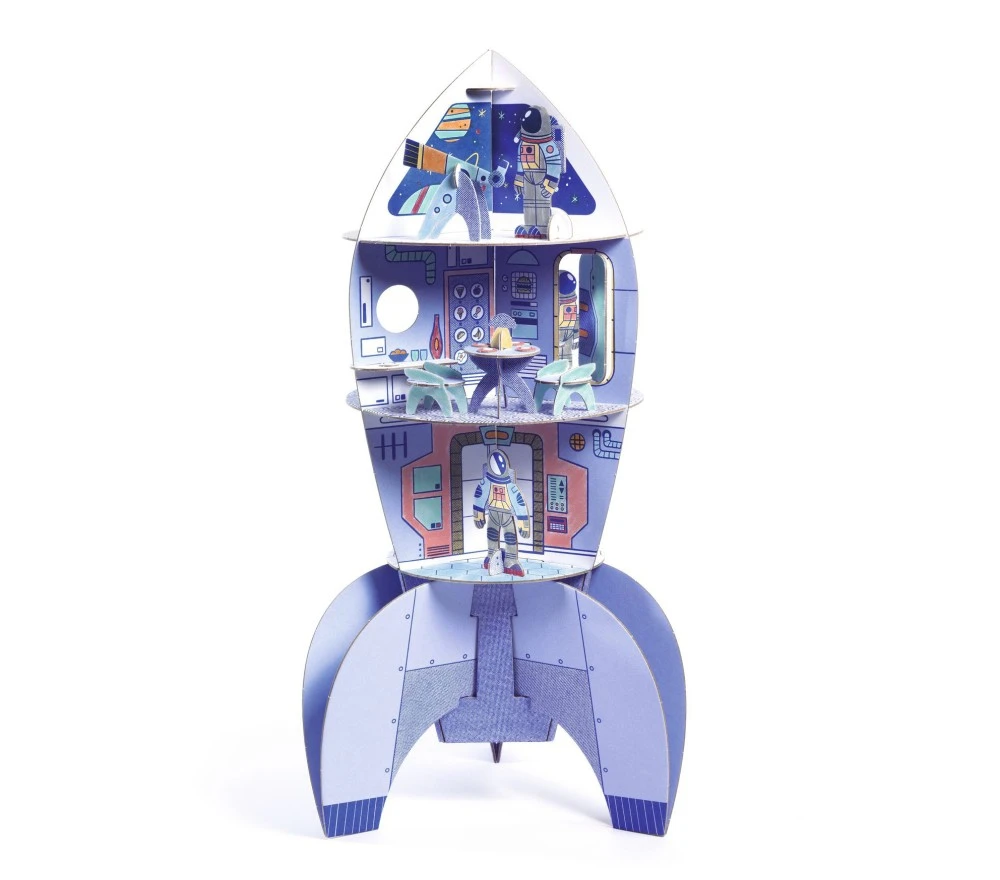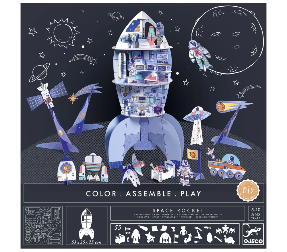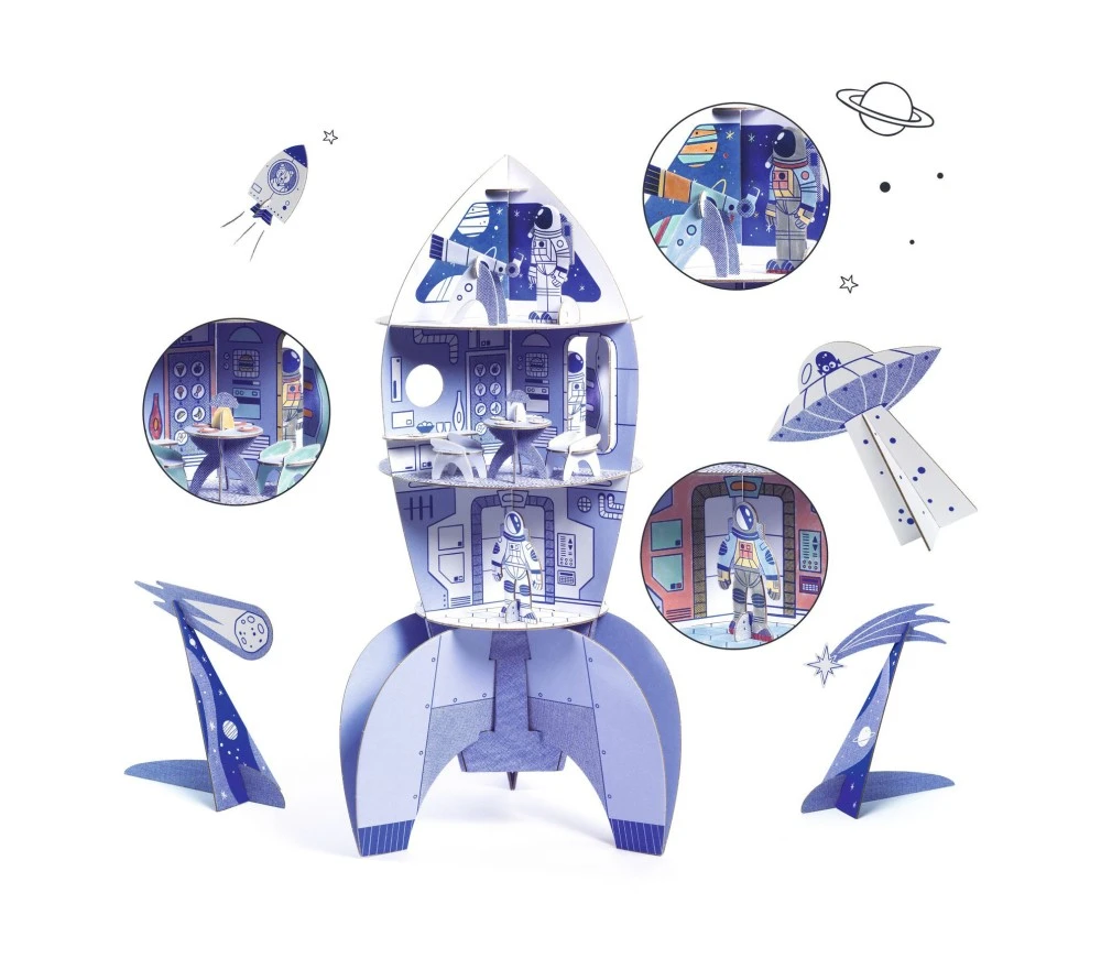 Un set creativo per colorare e assemblare un fantastico razzo spaziale, con personaggi e accessori. Il razzo ha 3 piani piani e più di 55 mobili e accessori (robot, satelliti, tavolette…).