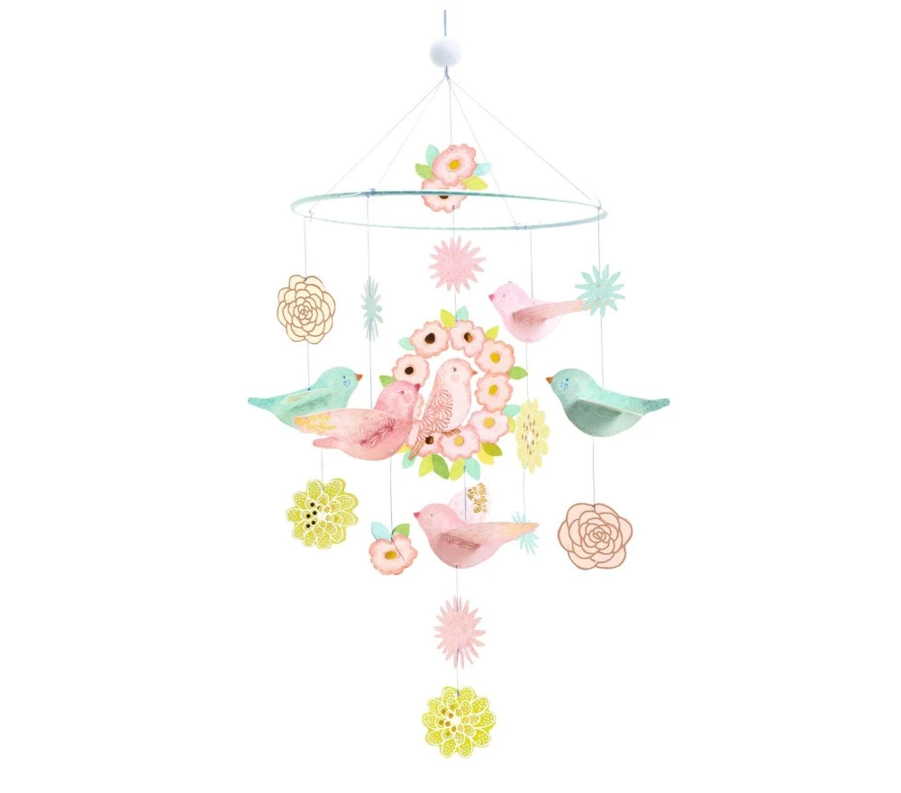 Basta un alito di vento per far danzare questa coloratissima giostrina a tema uccellini e fiori. Preassemblata, è un’idea regalo per una cameretta… ma anche per arredare qualsiasi stanza di casa con un tocco grazioso ed originale.