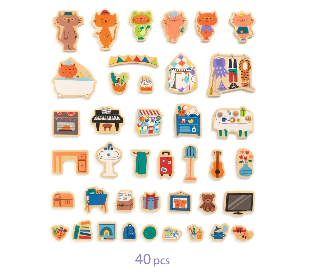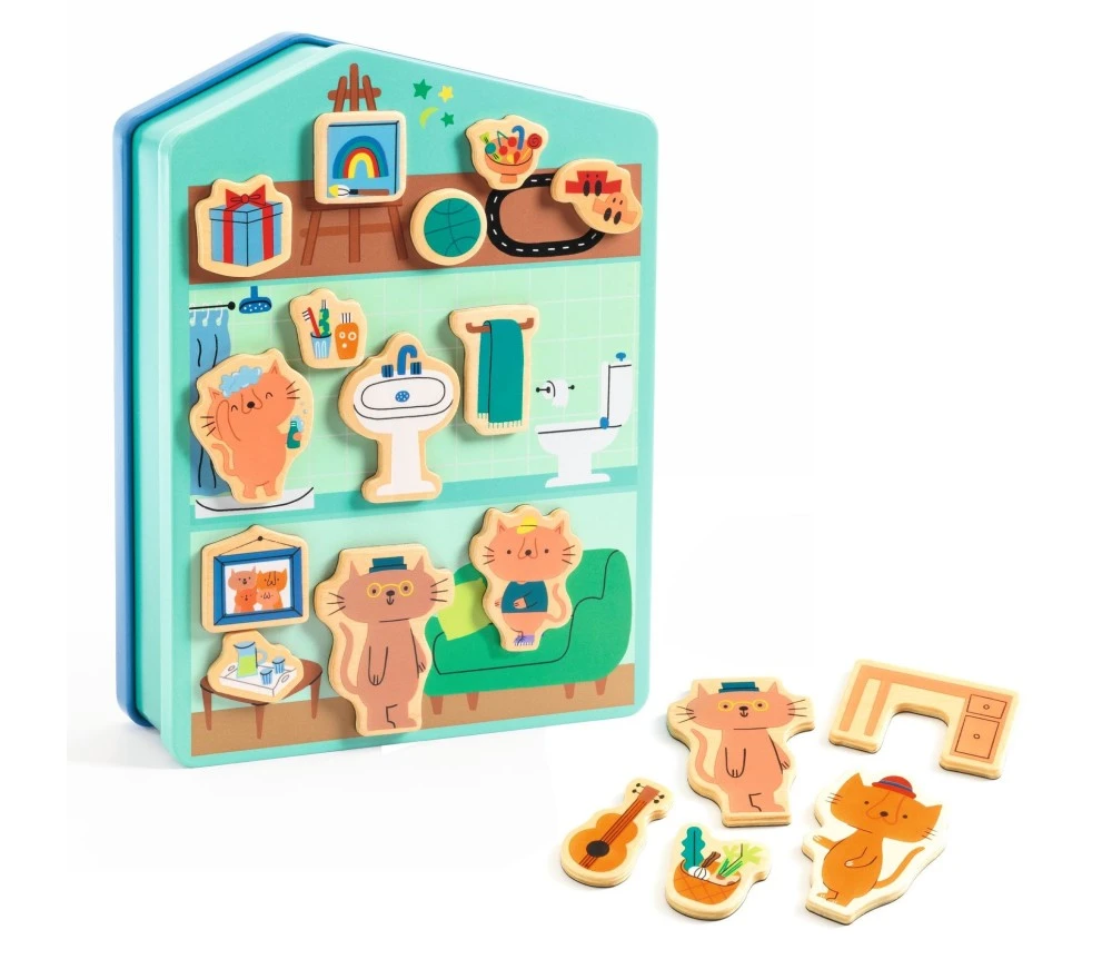 InZeHouse è costituito da una scatola in metallo a forma di casetta, illustrata da entrambe le parti, e 40 magneti in legno con cui comporre tante scenette domestiche. Promuove la fantasia e lo sviluppo del linguaggio.