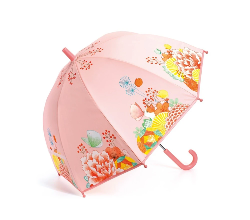 Un ombrello rosa dalle illustrazioni delicate e romantiche. Dimensioni 70 x 68 cm. L’apertura è manuale ed ha un sistema per impedire che i bimbi si pinzino le dita. Da 3 anni in su.