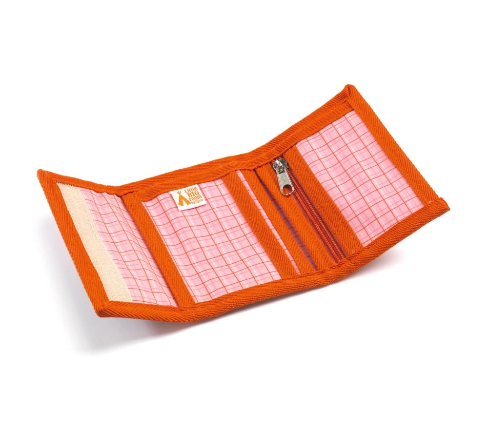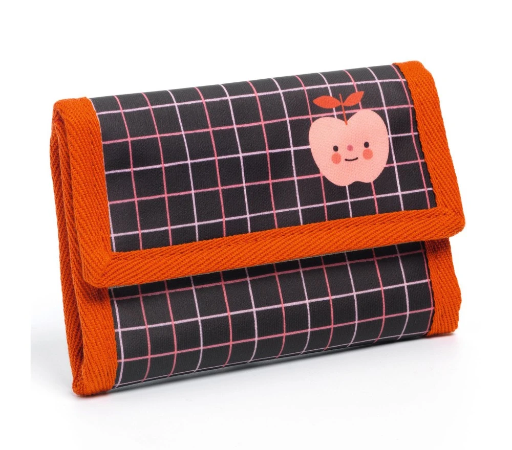 Un simpatico portafoglio con chiusura a velcro e illustrazioni adorabili per i piccoli risparmi dei bimbi. In cotone cerato e quindi impermeabile, ha anche uno scomparto con zip per le monete, tre scomparti per le carte e uno più grande per le banconote.