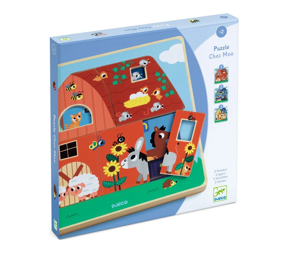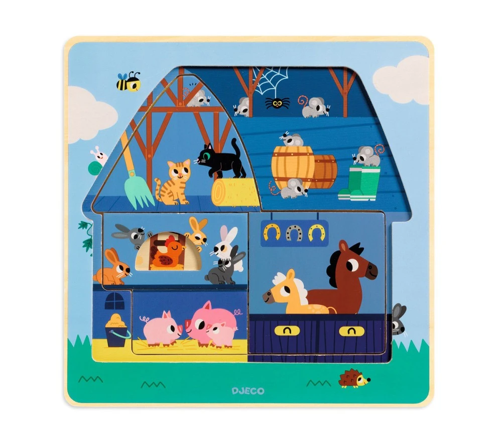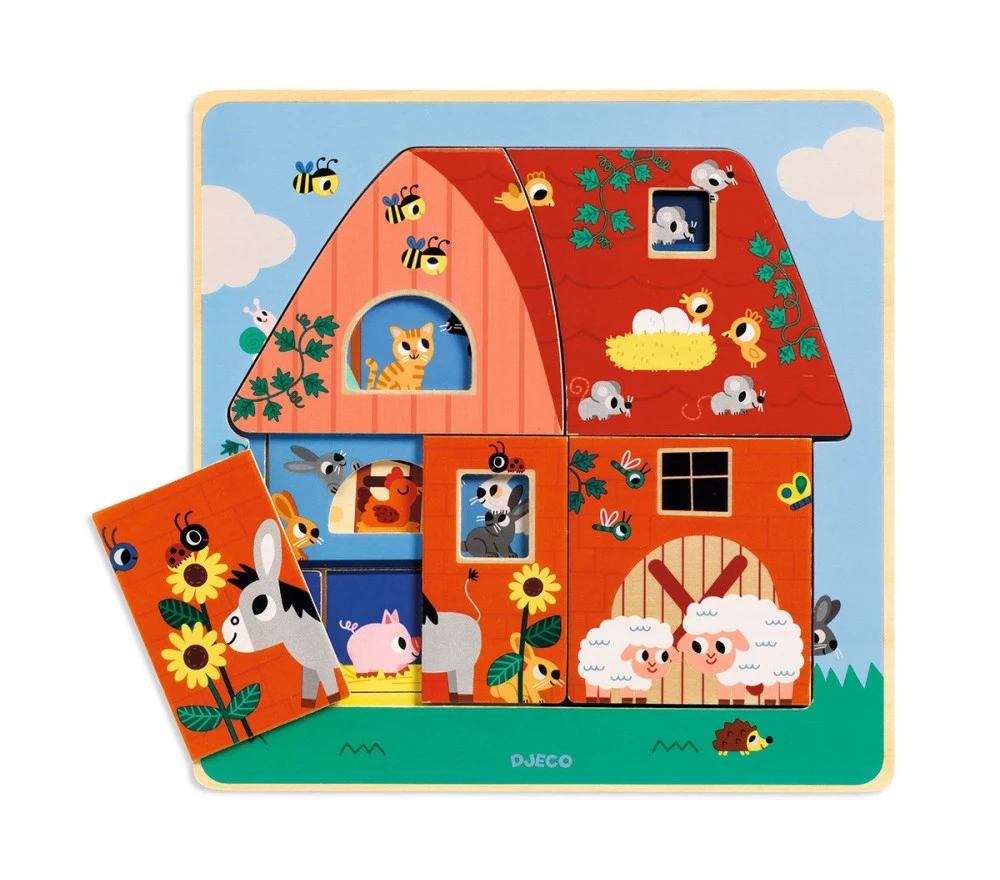 Un puzzle con tre strati diversi da scoprire: il primo strato rappresenta la facciata di una fattoria, dalle cui finestre sbucano alcuni animaletti, il secondo strato è l’interno della casetta dove scoprire tanti altri animali e l’ultimo un’ulteriore stanza, con 3 personaggi sagomati: i due fattori e una simpatica gallina!
