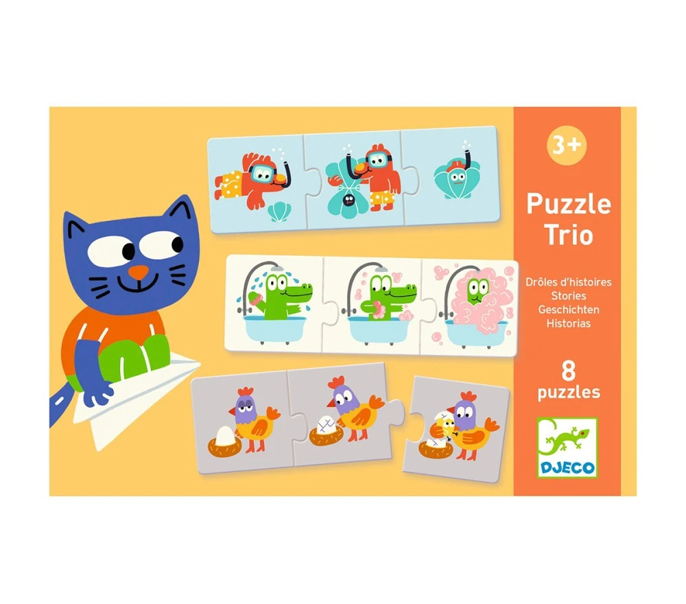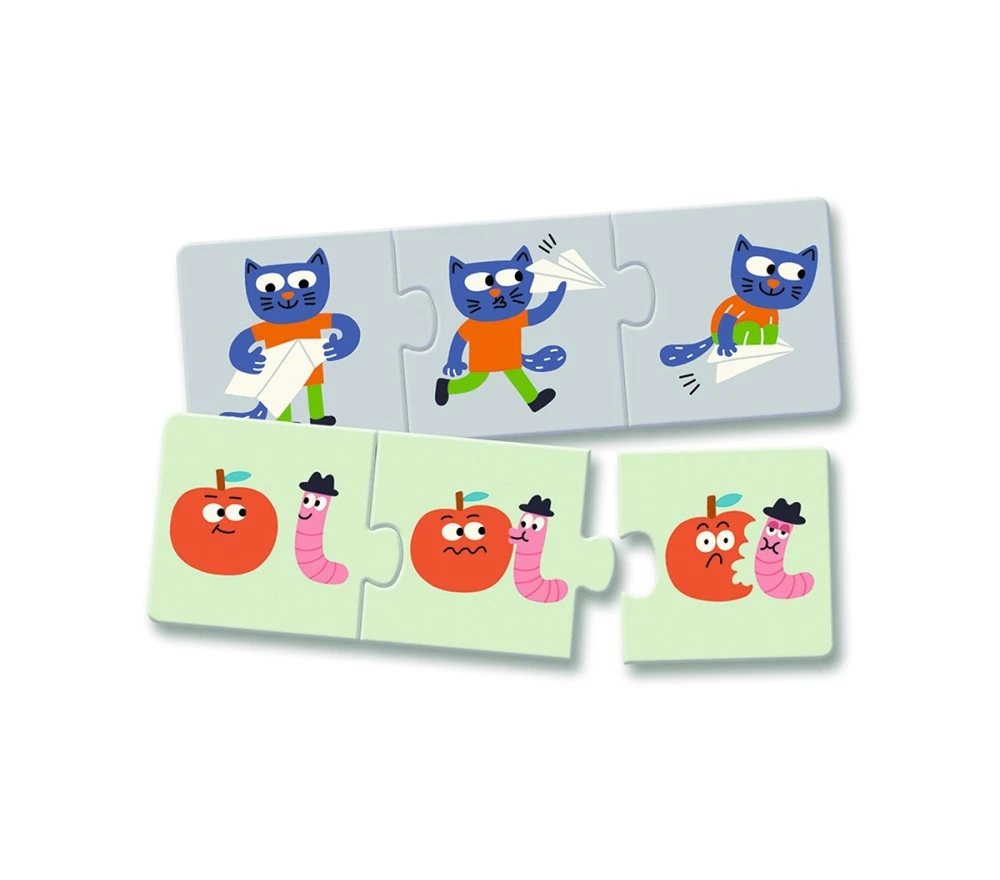Ventiquattro tessere in spesso cartone per formare 8 puzzle da 3 pezzi abbinando le 3 tessere che compongono simpatiche storielle, nell’ordine corretto.