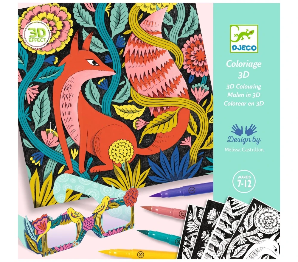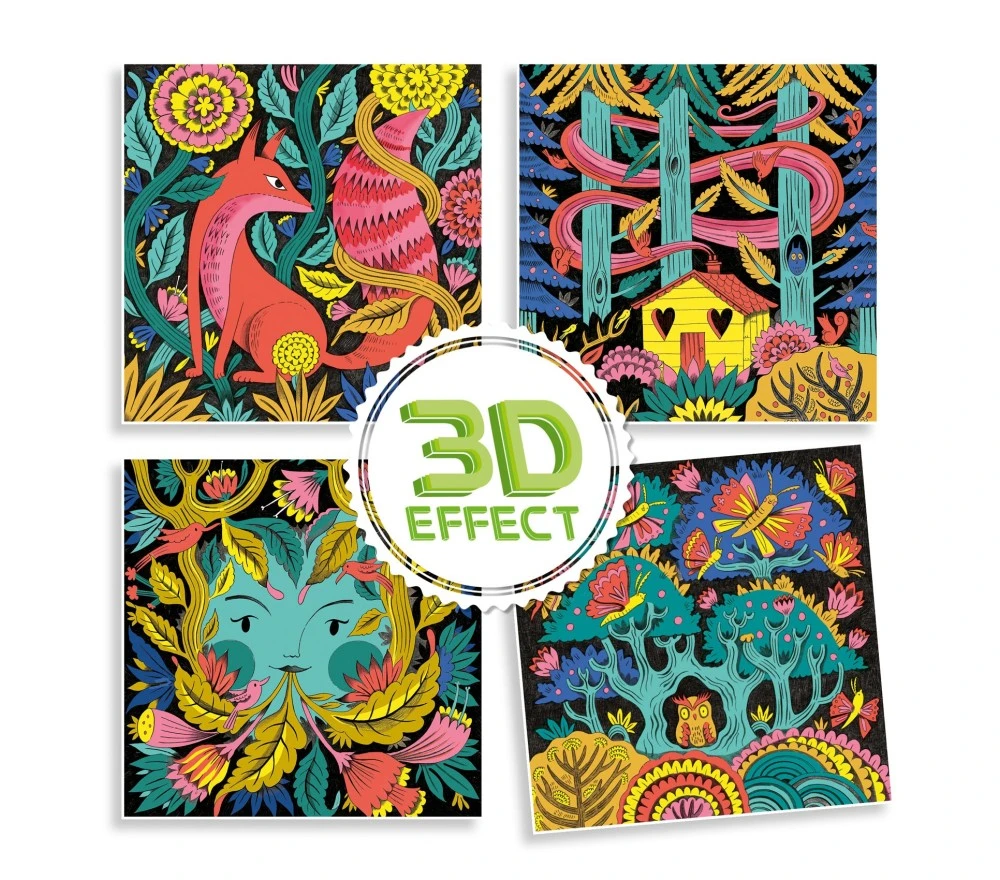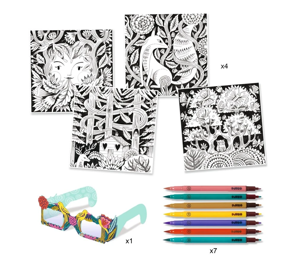 Un originale set con 4 meravigliose e divertenti illustrazioni da colorare, a tema foresta. Seguendo le istruzioni i bambini e le bambine completeranno i quadri e una volta indossati gli occhialini 3D inclusi…magia! I quadretti prendono vita diventando tridimensionali.