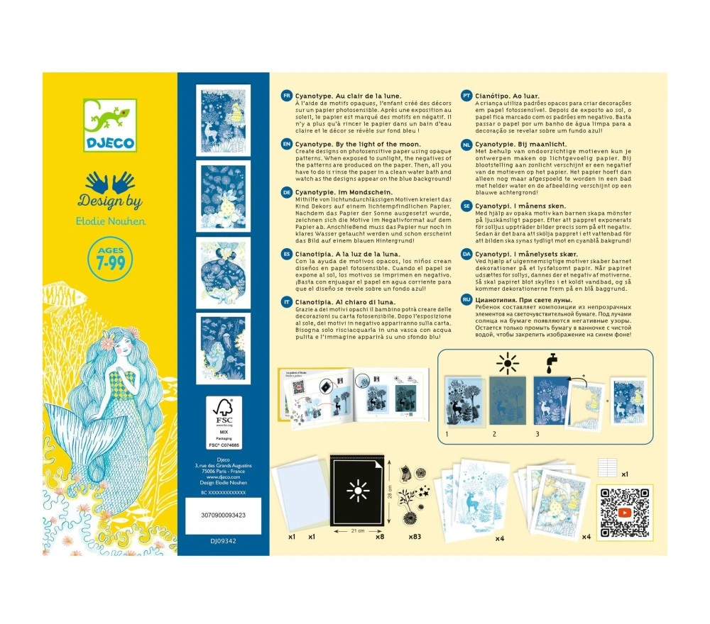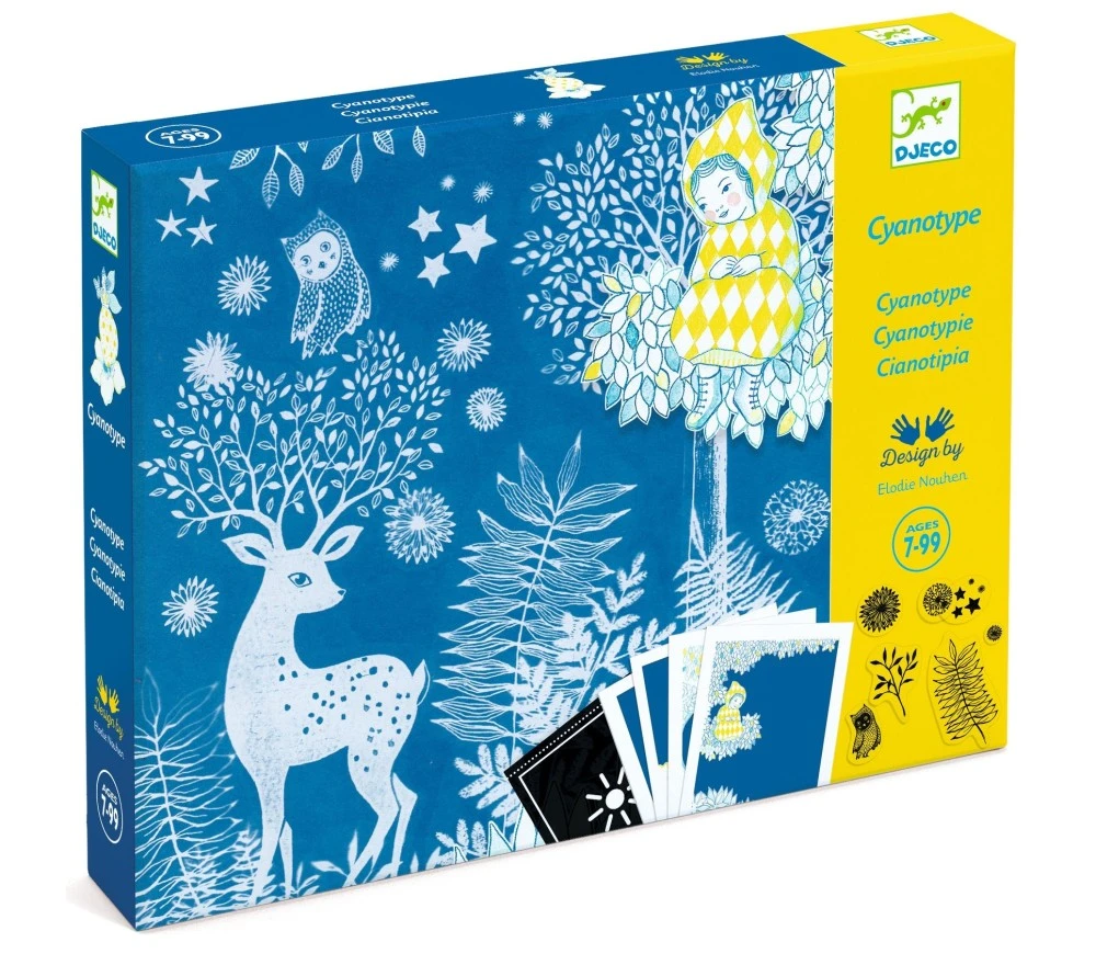 Questa magica attività si ispira a un procedimento preso in prestito dalla fotografia: la cianotipia o cianografia. Con dei motivi opachi il bambino crea dei decori su una carta fotosensibile. Dopo l’esposizione al sole la carta sarà impressa con i motivi in negativo. Bisogna solo risciacquare la carta in una vasca con acqua pulita e la decorazione si rivela su fondo blu! Queste creazioni diventano i fondi notturni che completano le illustrazioni di 4 quadri dalle illustrazioni poetiche.