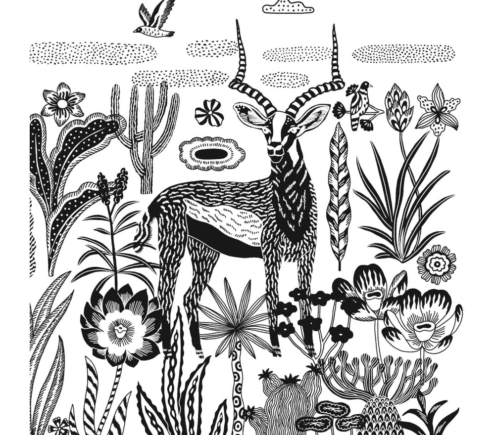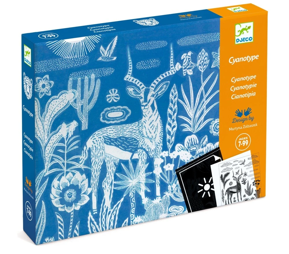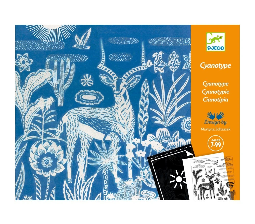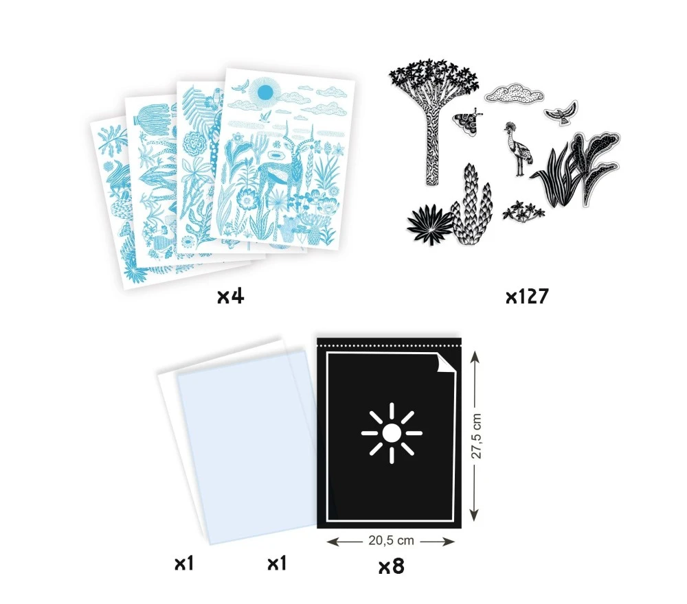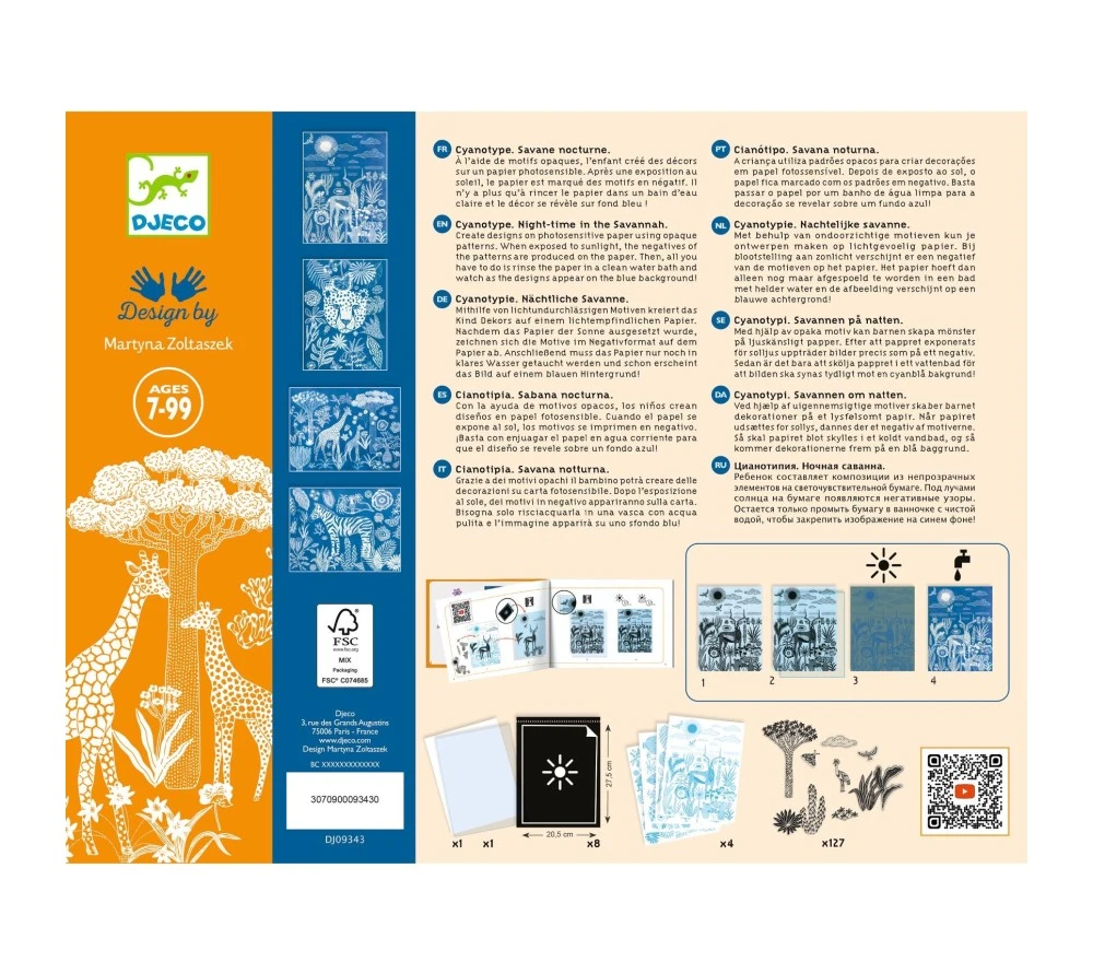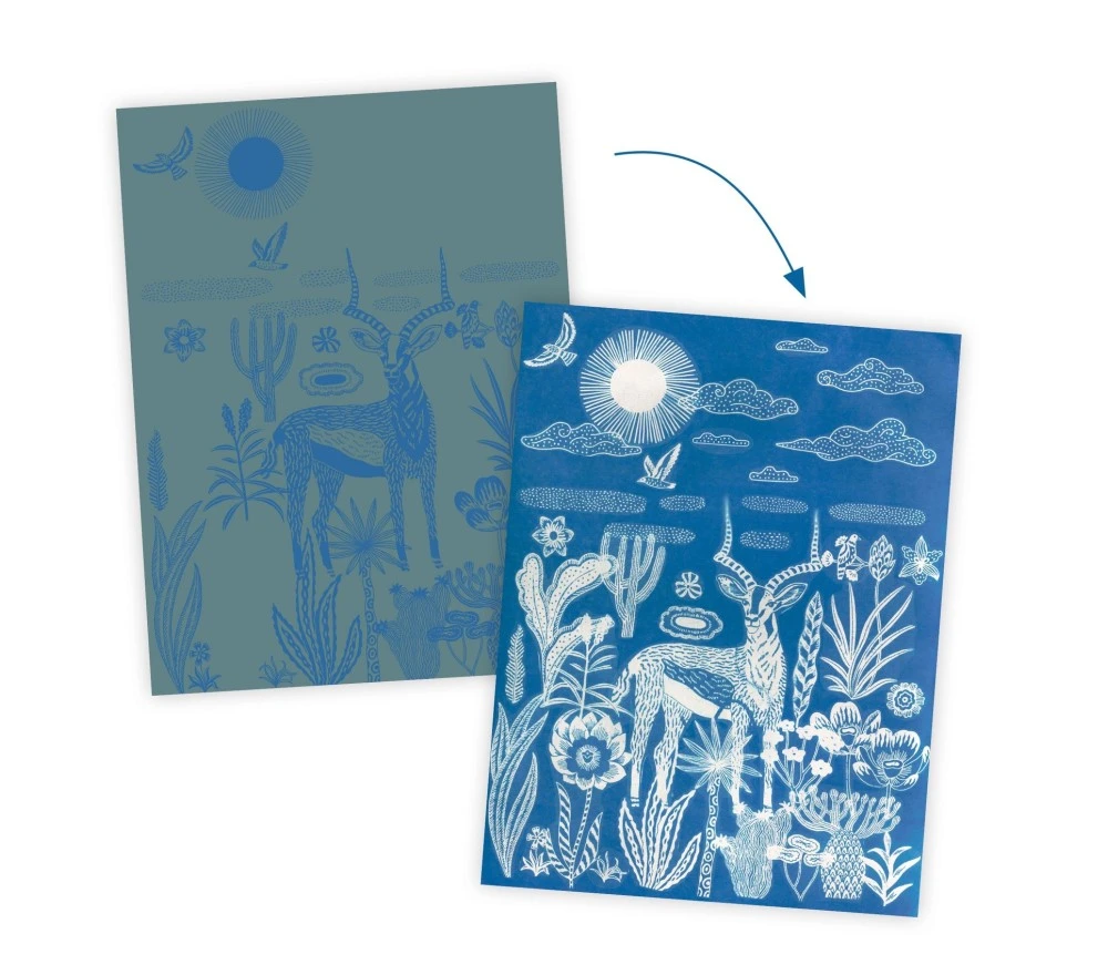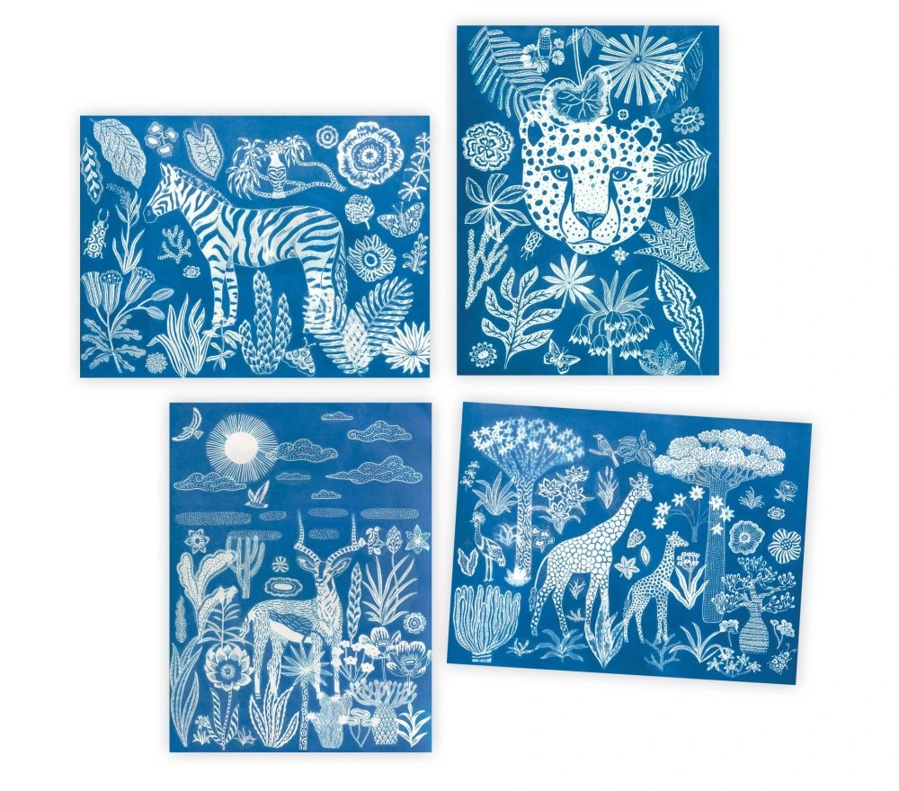 Questa magica attività si ispira a un procedimento preso in prestito dalla fotografia: la cianotipia o cianografia. Con dei motivi opachi il bambino crea dei decori su una carta fotosensibile. Dopo l’esposizione al sole la carta sarà impressa con i motivi in negativo. Bisogna solo risciacquare la carta in una vasca con acqua pulita e la decorazione si rivela su fondo blu! Queste creazioni diventano i fondi notturni che completano le illustrazioni di 4 quadri dalle illustrazioni a tema savana.