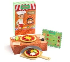 Contenuto: 1 tabellone di legno, 2 basi per la pizza di tessuto scamosciato, 2 basi di salsa al pomodoro e 10 accessori di feltro, 2 cartoni per la consegna, una scatola forno di legno.