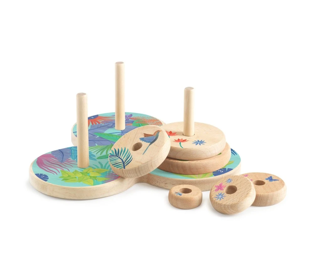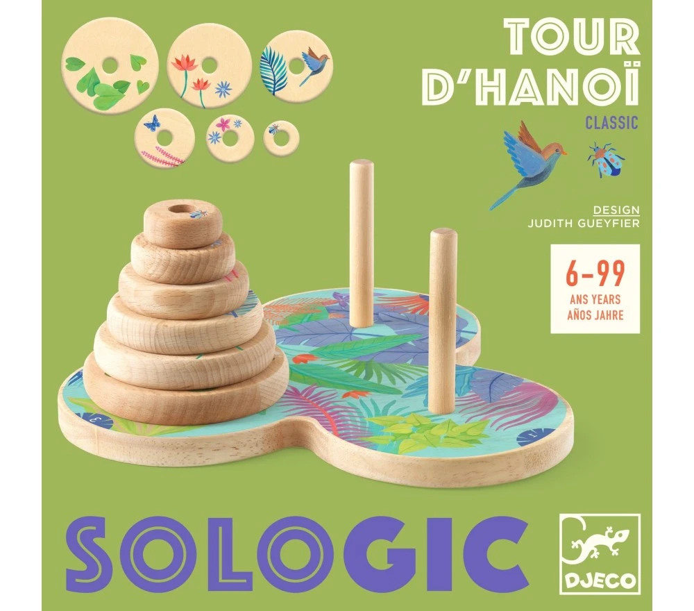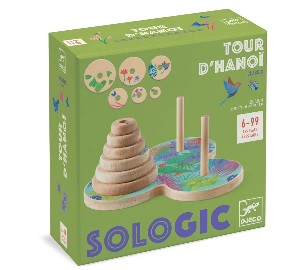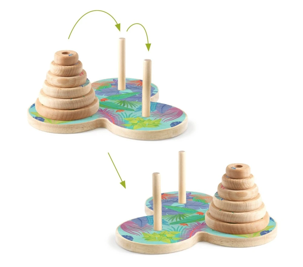 La torre di Hanoi è uno dei più classici rompicapi in legno. Questa versione di Djeco ha anche delle illustrazioni poetiche su ogni pezzo. Lo scopo del gioco è, creata la torre iniziale, riuscire a ricrearla su un altro piolo, spostando un pezzo alla volta e mettendo ogni pezzo nell’ordine corretto. E’ possibile mettere un disco solo sopra un altro più grande (non si può mettere un disco grande su uno più piccolo). Sfruttando i pioli e studiando i passaggi sarà possibile risolvere il rompicapo! Si può risolvere in tanti modi, ma lo scopo è riuscire a fare meno passaggi possibili!