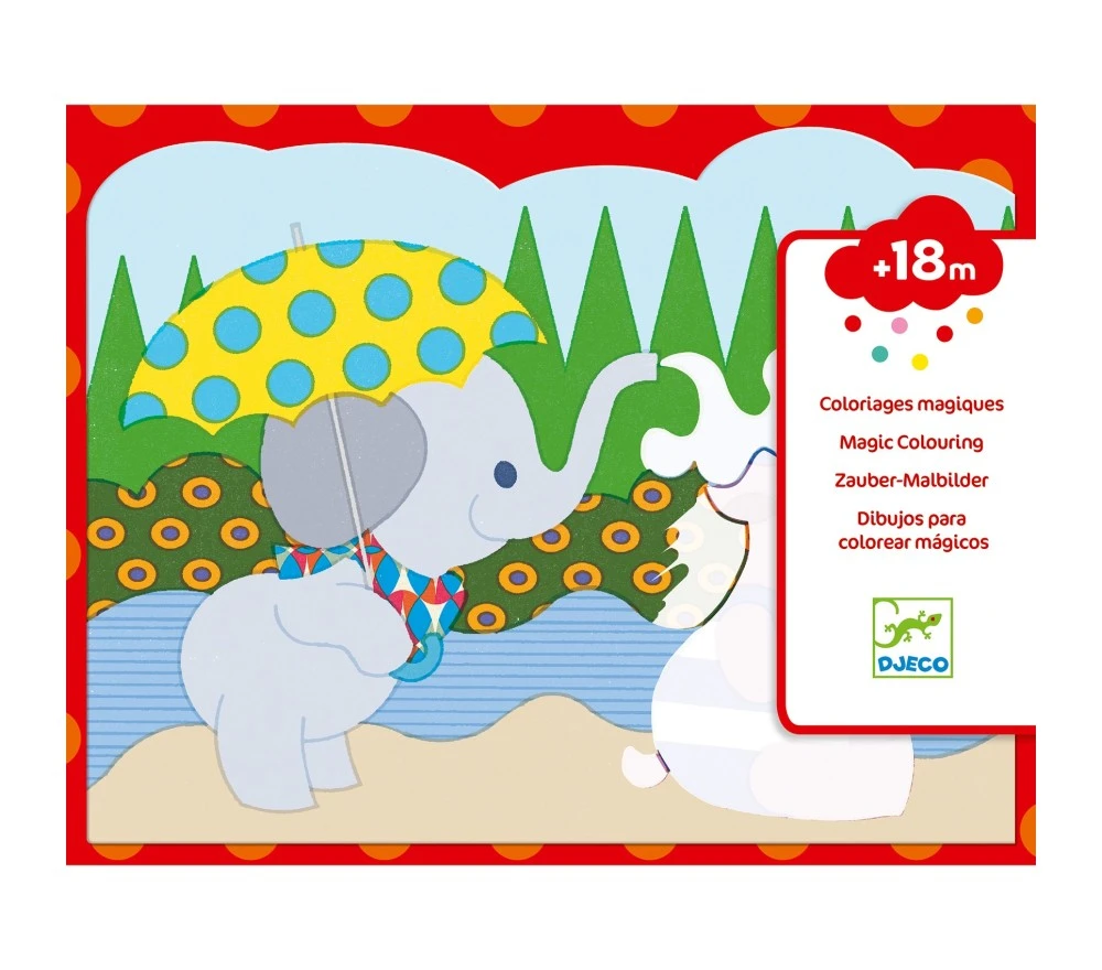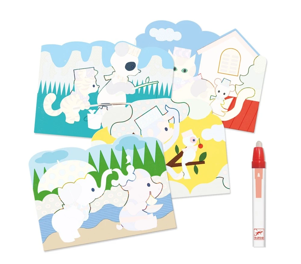 Un set creativo per i più piccoli semplice ma di grande effetto. Riempiendo la penna di acqua e passandola sopra le parti bianche compariranno magicamente delle immagini. Quando il disegno si asciuga i disegni scompaiono nuovamente e si può ricominciare il divertimento! Il set contiene 4 disegni e 1 pennarello magico. Da 18 mesi in su.