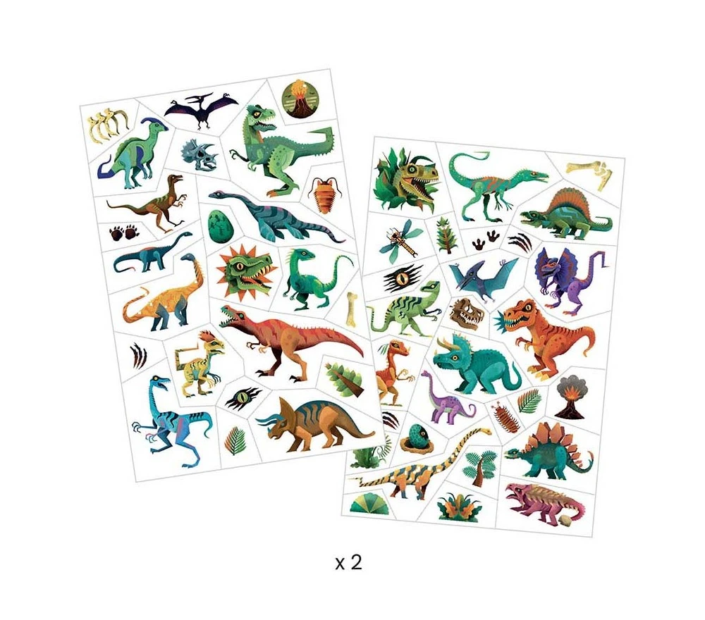 Da Djeco un set di fantastici tatuaggi temporanei per gli amanti dei dinosauri! Facili da applicare e da rimuovere sono dermatologicamente testati e sicuri al 100%.