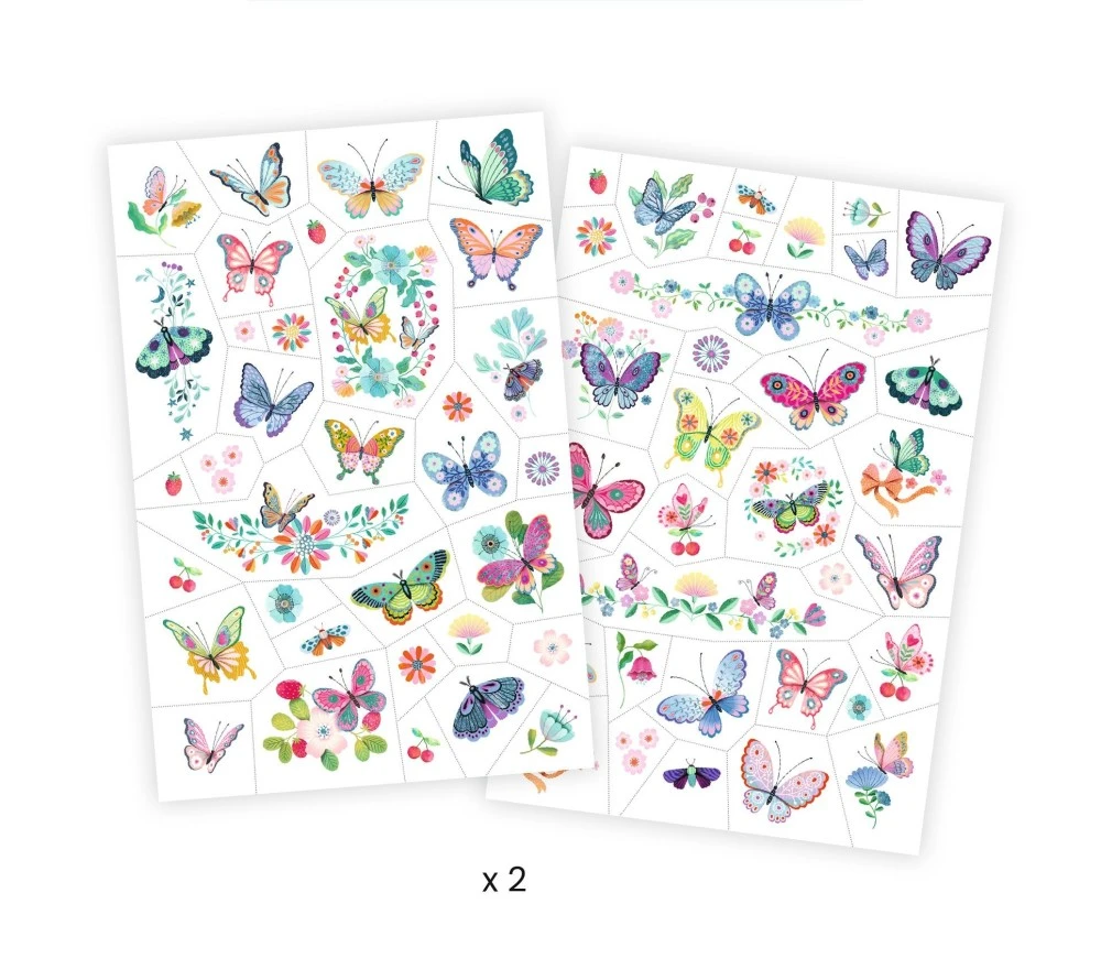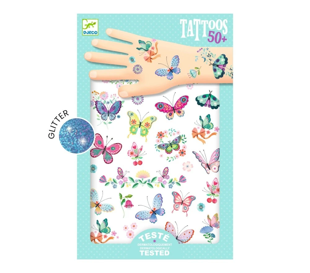 Da Djeco un set di allegri e colorati tatuaggi temporanei con meravigliose farfalle dai dettagli glitterati! Facili da applicare e da rimuovere sono dermatologicamente testati e sicuri al 100%.