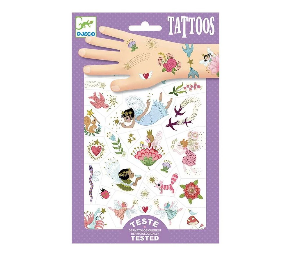 Da Djeco un set di fantastici tatuaggi temporanei a tema fate, con dettagli metallizzati! Facili da applicare e da rimuovere sono dermatologicamente testati e sicuri al 100%.