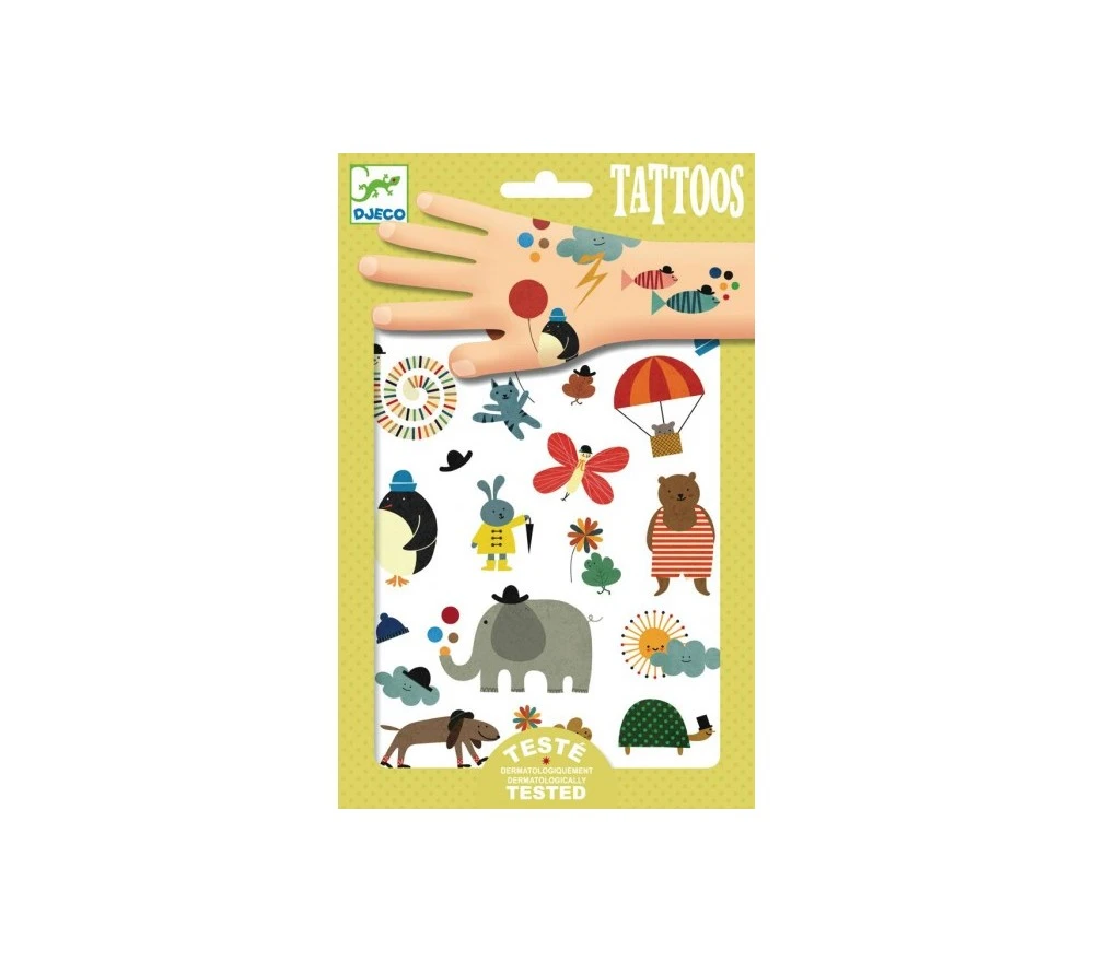 Da Djeco un set di fantastici tatuaggi temporanei e rimovibili a tema animali. Facili da applicare e da rimuovere sono dermatologicamente testati e sicuri al 100%.