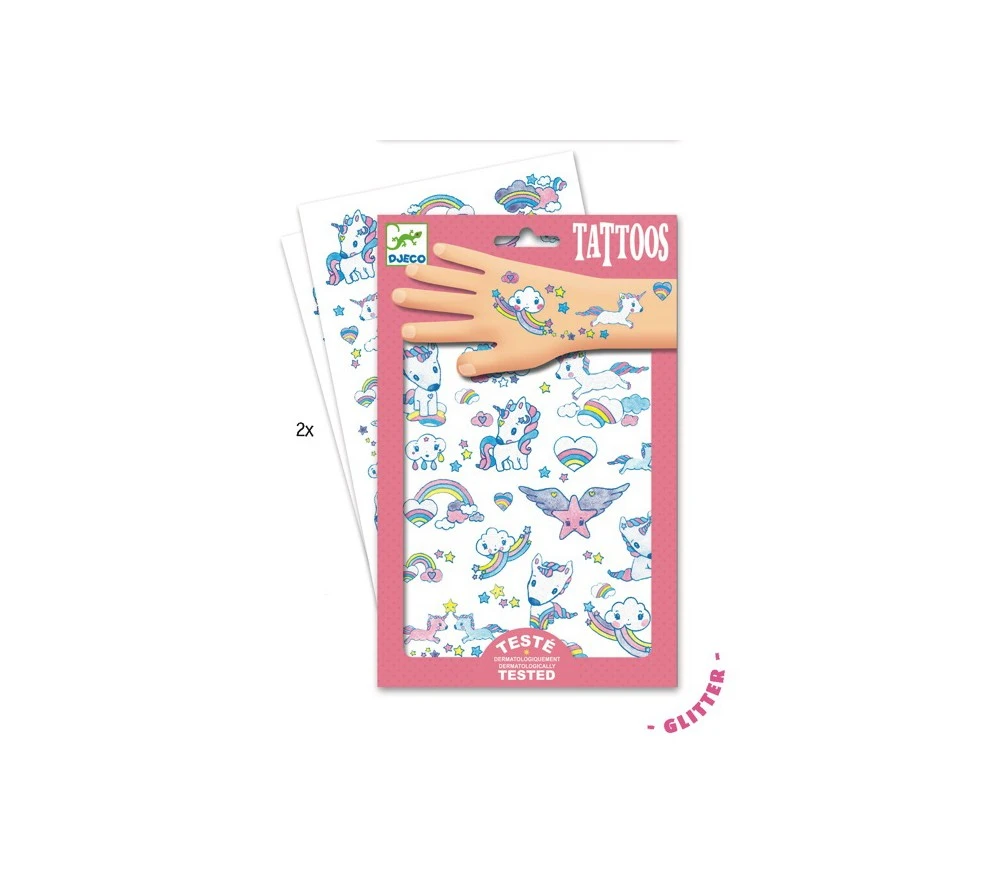Da Djeco un set di fantastici tatuaggi temporanei e rimovibili a tema unicorni, con un magico effetto glitter. Facili da applicare e da rimuovere sono dermatologicamente testati e sicuri al 100%.