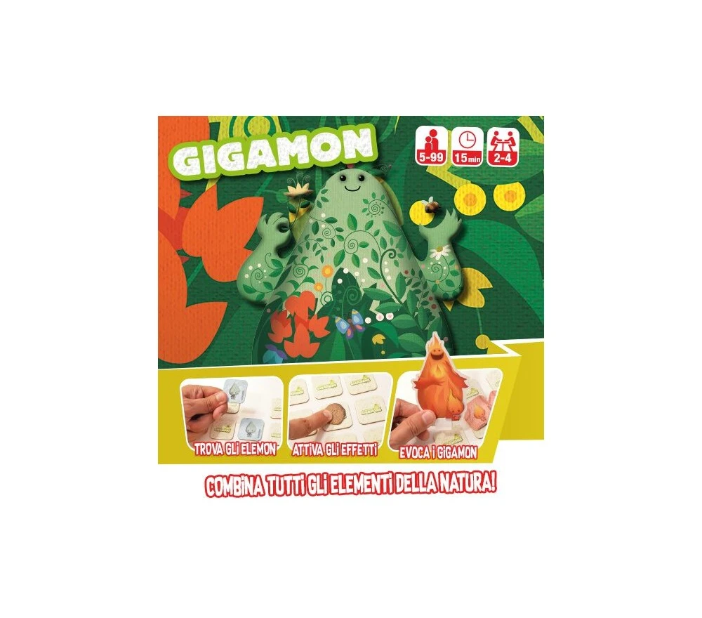 Trovate e fondete le coppie di Elemon per evocare i grandi Gigamon! Ogni Elemon è collegato ad un elemento della natura ed avrà un particolare effetto di gioco! Siete pronti a rilasciare la forza dei Pyromon o a vedere nel futuro grazie agli Hydramons? Sarete in grado di evocare tutti i Gigamon e diventare maghi?