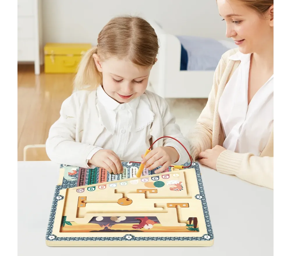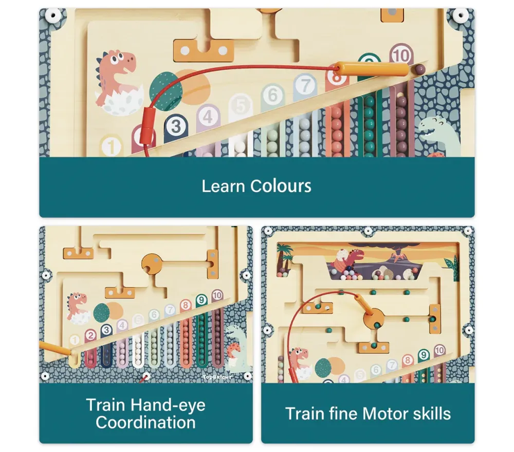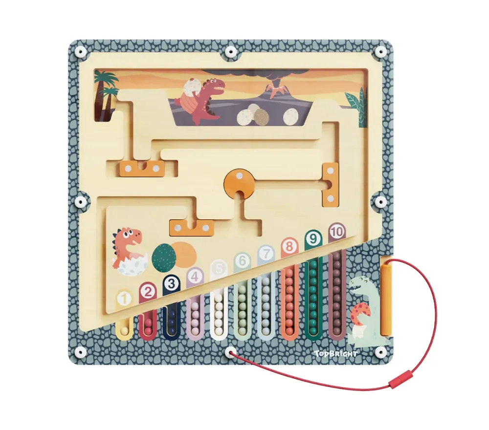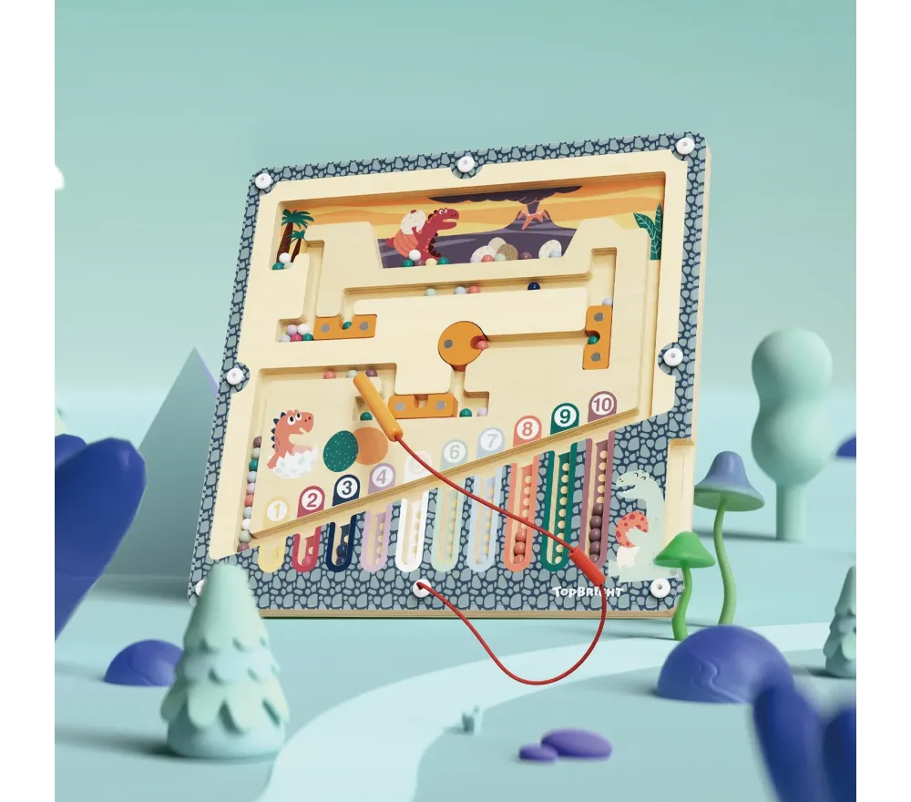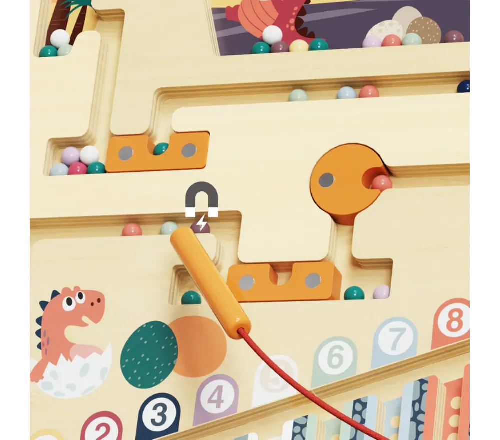 Aiuta il dinosauro a raggruppare correttamente le uova (ovvero le palline) dei vari colori, prima che il vulcano erutti! In questo labirinto magnetico i bimbi potranno allenare la motricità fine, la coordinazione occhio-mano, la pazienza e la logica: utilizzando la penna magnetica dovranno spostare le palline seguendo vari percorsi e superando gli ostacoli. Inoltre potranno imparare i numeri da 1 a 10