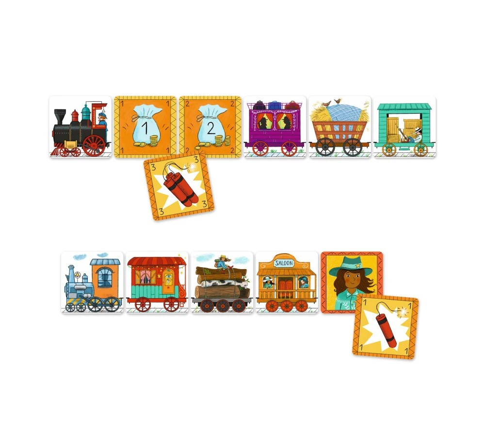 Nel Far West, sui binari tutto è permesso: tirate fuori tutti i vostri assi nella manica per creare il treno più lungo e attaccare i vagoni dei concorrenti senza farvi acchiappare dagli sceriffi! Per avere il treno con più vagoni alla fine della partita, è necessario ricordare dove si trova l’oro degli avversari per attaccare i vagoni giusti.