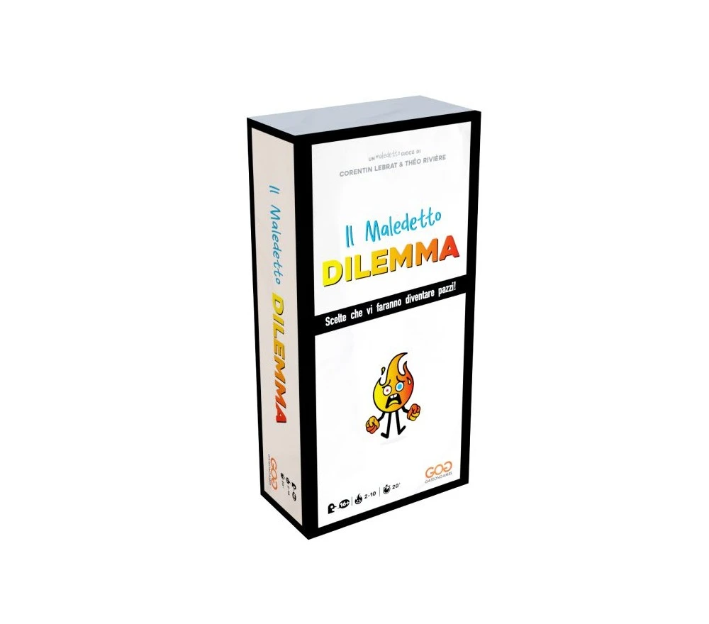 « Puoi leggere i pensieri degli altri MA ogni mattina sbatti il mignolo del piede contro un tavolino. » « Puoi viaggiare avanti o indietro nel tempo di 100 anni MA ogni volta che starnutisci passa un mese. » « Puoi capire tutte le lingue del mondo MA ogni volta che prendi il treno è pieno di bambini urlanti. » Rispondete a un dilemma accettandolo… o rifiutandolo! Gli altri giocatori riusciranno a indovinare cosa avete scelto? Il Maledetto Dilemma è il gioco di carte ideale per le feste. Preparatevi per rivelazioni sorprendenti sui vostri amici e familiari! Un giocatore per turno dovrà prendere la decisione, tutti gli altri dovranno cercare di indovinare la sua scelta. Accetterà il dilemma o lo rifiuterà? Man mano che i dilemmi si susseguono, i giocatori si immergono in animati dibattiti, cercando di leggere la mente degli altri e anticipare le scelte fatte. Le regole sono semplici, ma il gioco è pieno di sorprese! Ogni dilemma rivela molto sulla personalità di ogni giocatore, sul suo senso dell’umorismo e sulla sua propensione al rischio. L’obiettivo finale è segnare punti indovinando correttamente se il giocatore accetterà o rifiuterà il dilemma. Con risate e suspense ad ogni turno, Il Maledetto Dilemma vi stupirà e vi farà divertire. Siete pronti a mettere alla prova le decisioni dei vostri amici e a fare scelte difficili? Oserete accettare dilemmi eccentrici e affrontarne le conseguenze? Il Maledetto Dilemma contiene oltre 10.800 possibili dilemmi!