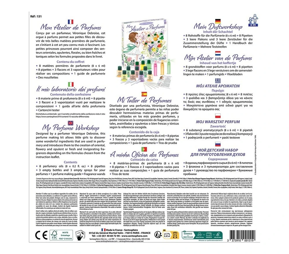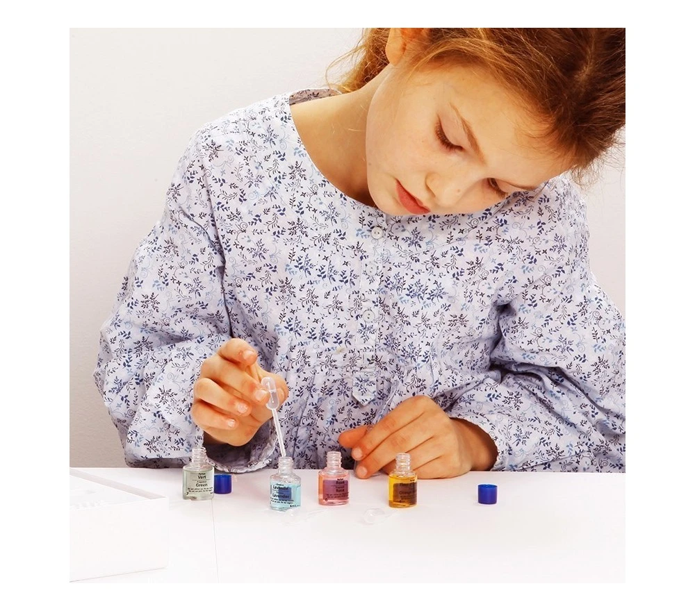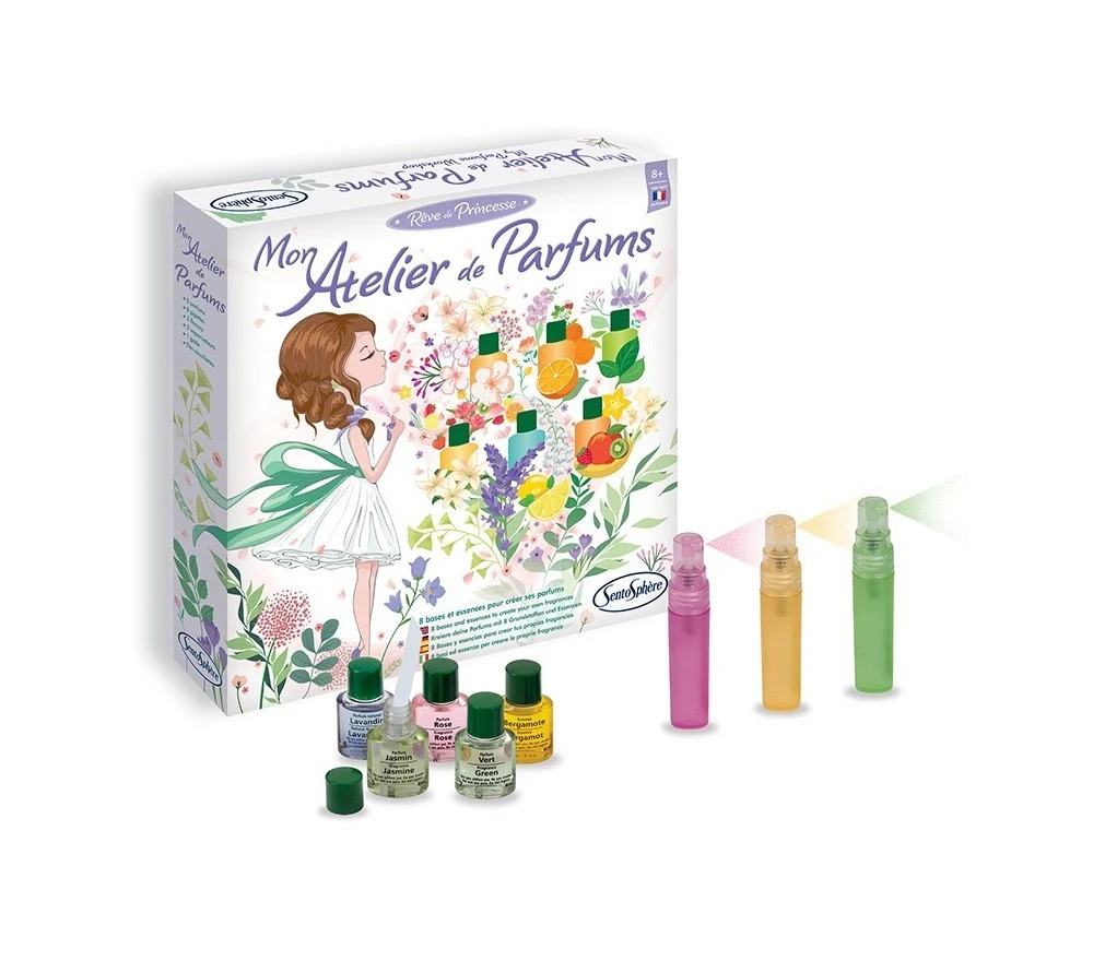 Un divertentissimo kit per creare deliziosi profumi personalizzati! La scatola contiene 8 essenze da 6 ml (fragranza muschiata, fragranza fruttata, arancio, mughetto, limone, fragranza verde, lavanda e fiori d’arancio), 8 pipette, 1 confezione di cartoncini per testare le fragranze, 3 flaconi e 3 vaporizzatori, 1 guida del profumiere. Un gioco creativo che piacerà alle bimbe… e alle mamme! Da 8 anni in su.