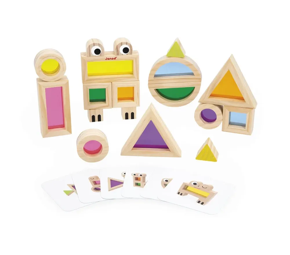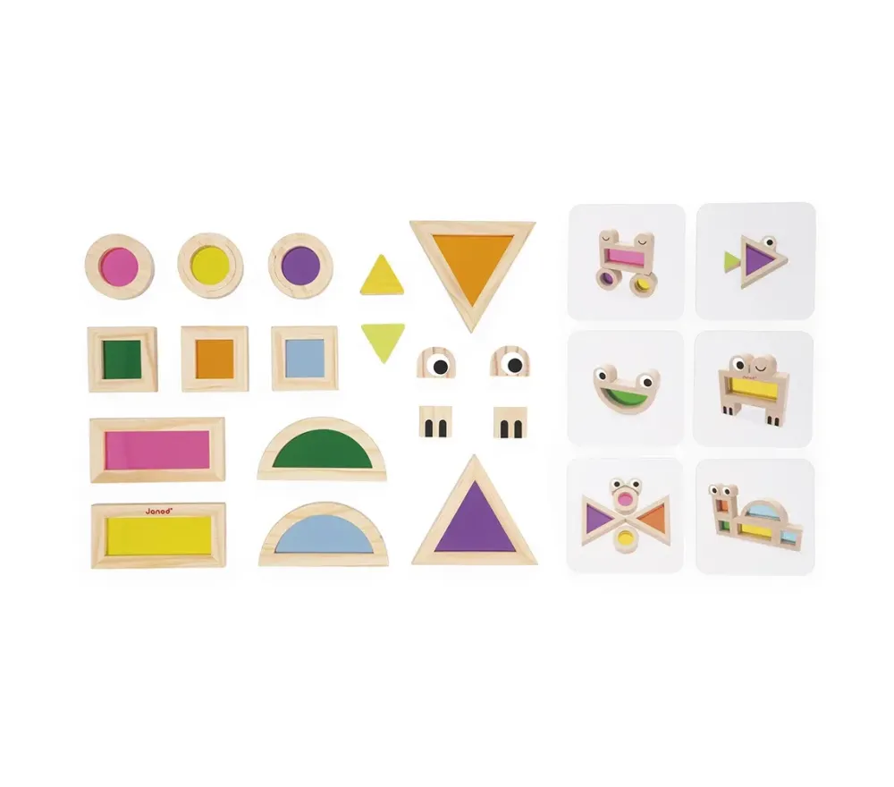 Contenuto: 12 forme geometriche colorate trasparenti (arancione, rosa, giallo, viola, blu e verde) e 6 blocchi di legno sono stampati con occhi, zampe o orecchie. 6 schede per riprodurre diversi animaletti.
